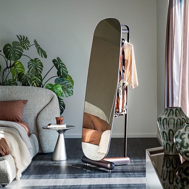 Вешалка с минималистским дизайном сзади состоит из двух стальных стоек с нескользящим профилем, идеально подходящих для подвешивания пиджаков и брюк. Ширина зеркала рассчитана на то, чтобы полностью скрыть одежду, висящую на современном немом слуге, и сохранить визуальный порядок в комнате.