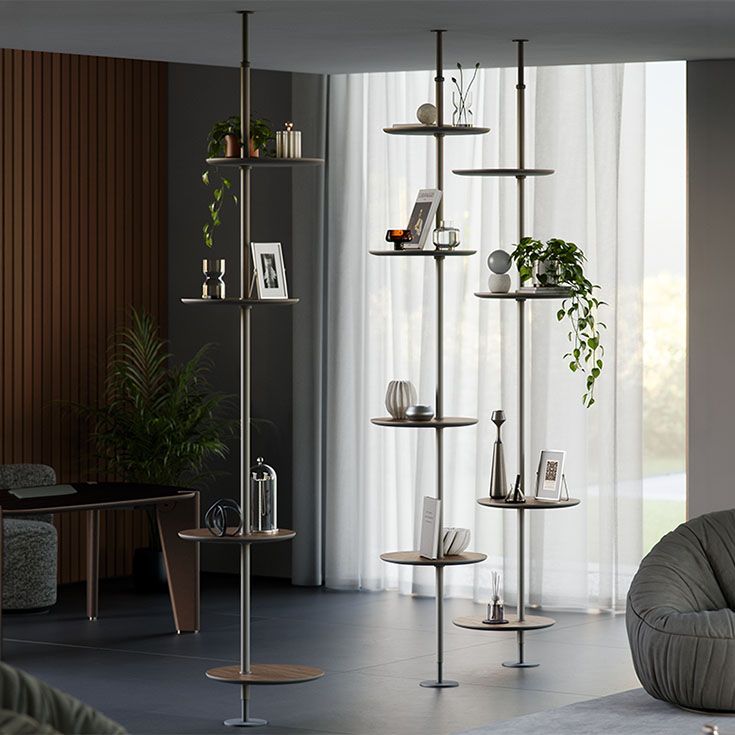 Свобода творчества, которую обеспечивает этот книжный стеллаж с потолочным креплением и круглыми полками, позволяет создавать бесконечные конфигурации на стене и в центре комнаты. Можно искать геометрию в симметричных или идеальных спиральных композициях, можно воспроизвести динамику хаоса, расположив несколько модулей с кажущейся произвольностью, или же создать разделительные элементы в центре комнаты, разместив несколько модульных книжных стеллажей, которые подсказывают путь в пространстве благодаря мягким изгибам полок. Единый элемент, расположенный на определенном расстоянии от стены, напротив, превращается в декоративный книжный стеллаж с удивительным эффектом, как скульптура или произведение искусства.