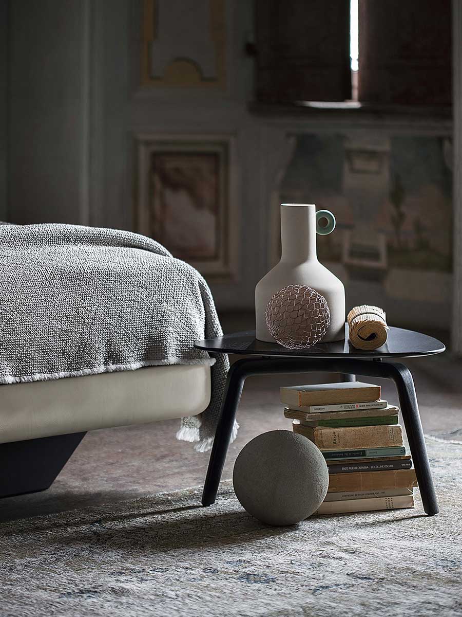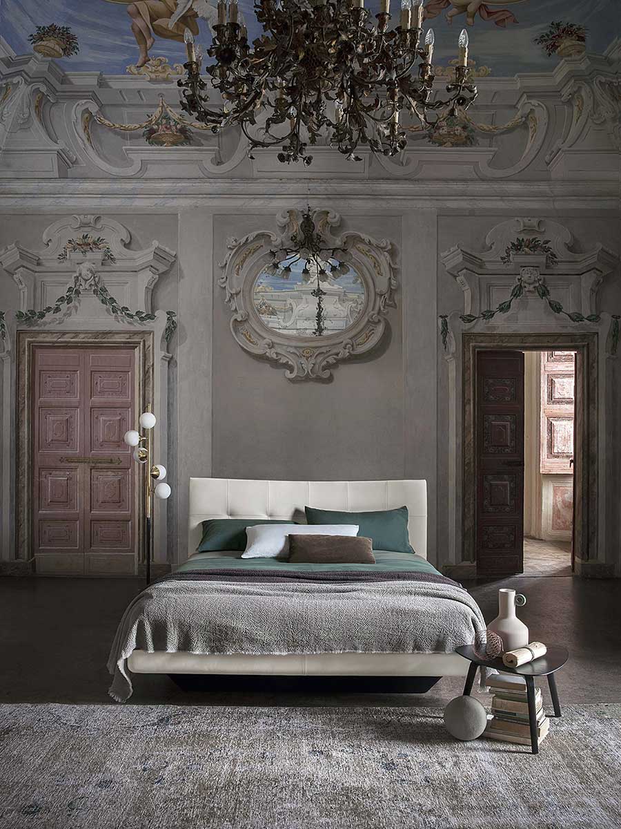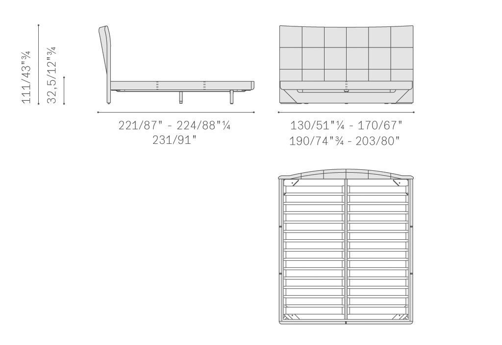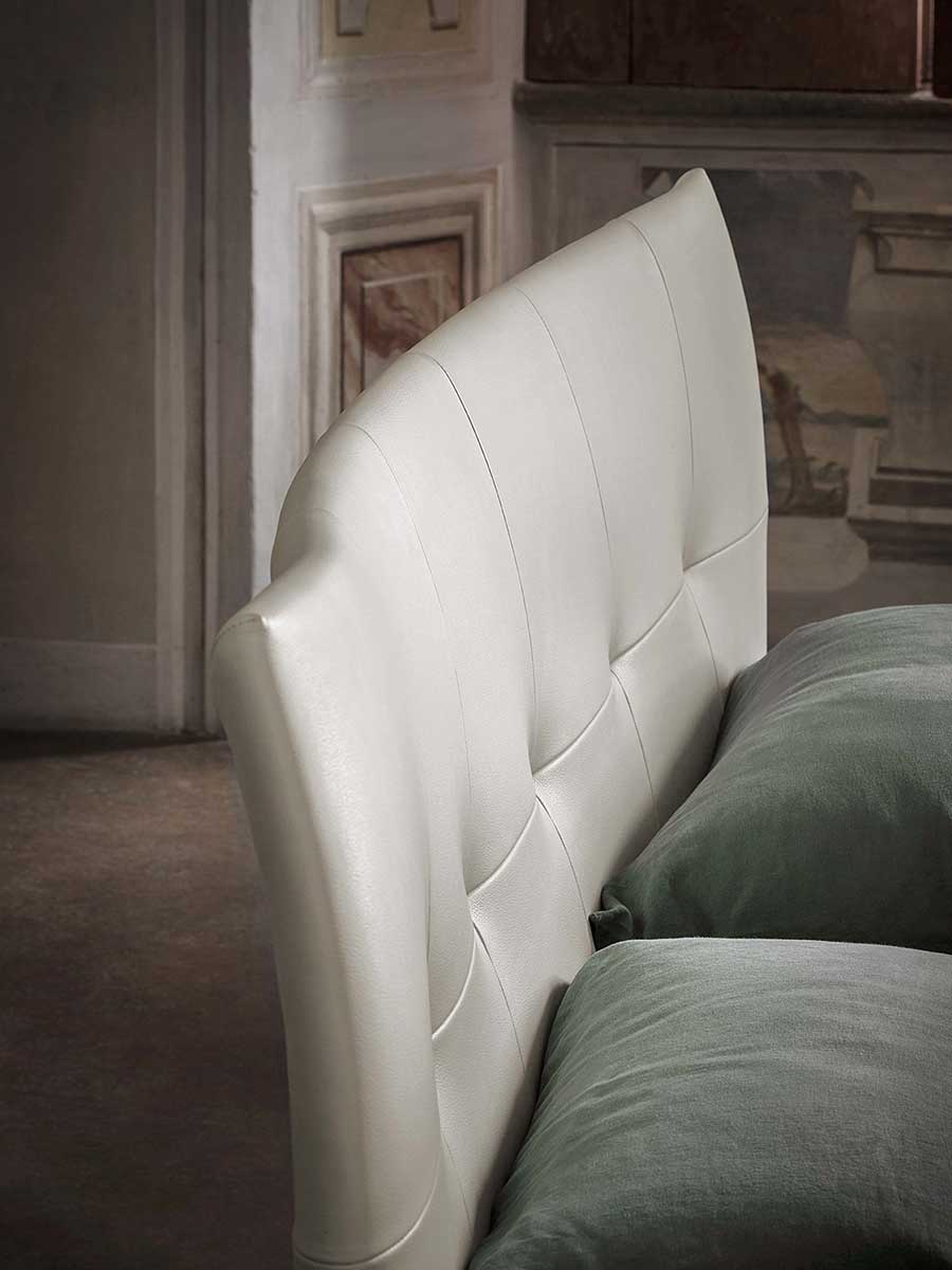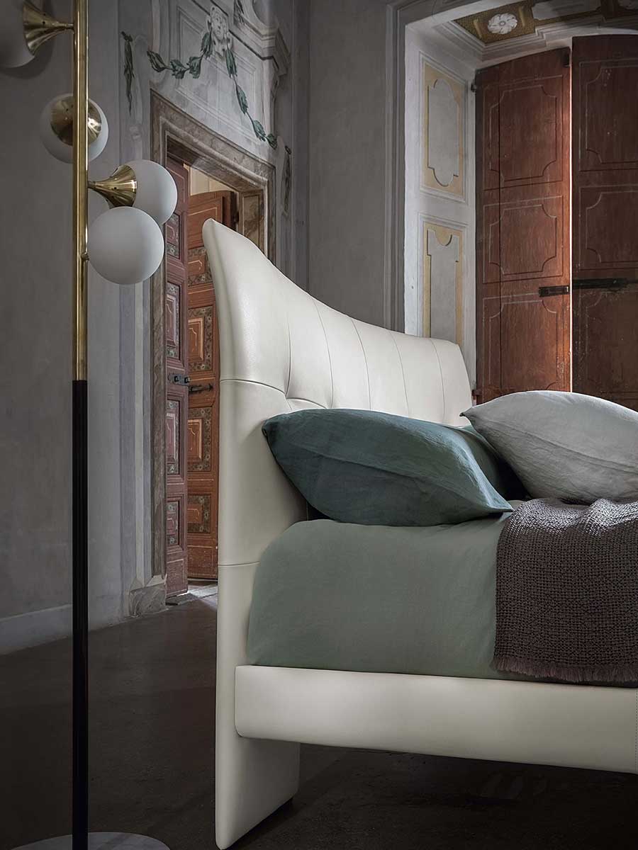 Изголовье кровати Aurora Due выполнено из массива бука с лёгкой набивкой и обито кожей Pelle Frau®. Основание кровати обито полиуретановой пеной с лёгкой набивкой, боковины изготовлены из еловой фанеры, а изножье – из тополя. Передние углы украшены кожаной отделкой. Задние ножки кровати Aurora Due образуют изголовье, которое доходит до пола, а переднее основание выполнено из дерева с чёрной устойчивой к царапинам краской и представляет собой цельную трапецию той же ширины, что и кровать. Металлическое основание имеет ту же форму, но полое внутри и доступно в чёрном, тёмно-сером и хромированном вариантах отделки.
