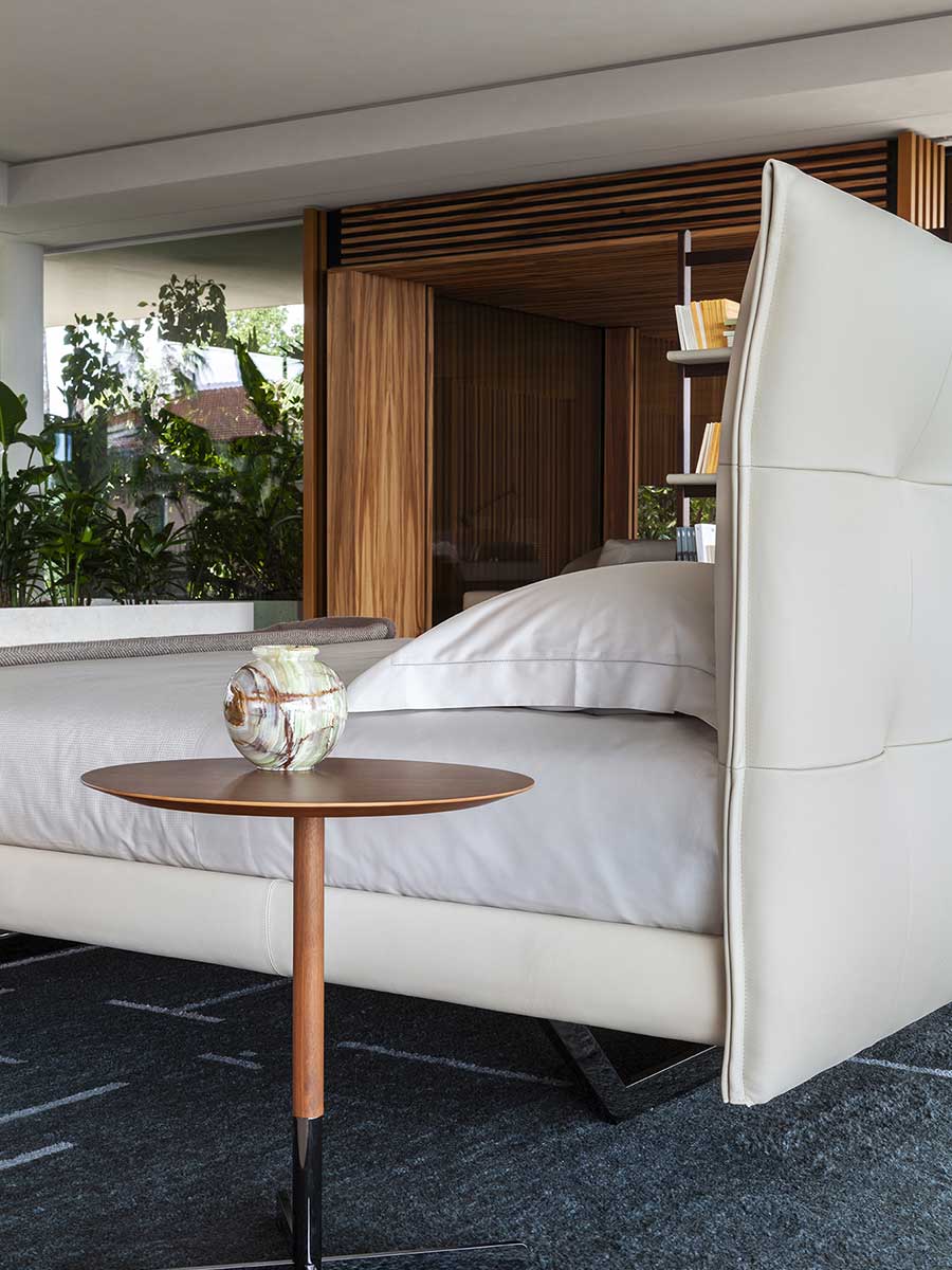 Aurora Tre отличается обволакивающей формой, создаваемой изгибом каркаса, изготовленного из берёзовой фанеры. Мягкость обеспечивается внутренней набивкой из пенополиуретана различной плотности и полиэстеровой ваты, на которую выдающиеся мастера Poltrona Frau закрепляют обивку с помощью ряда вручную прошитых стежков. Модель доступна в цвете Pelle Frau®. Опорные ножки изготовлены из металла, доступного в культовой трапециевидной форме с двумя различными вариантами отделки или в виде цилиндров из чёрного лакированного металла.