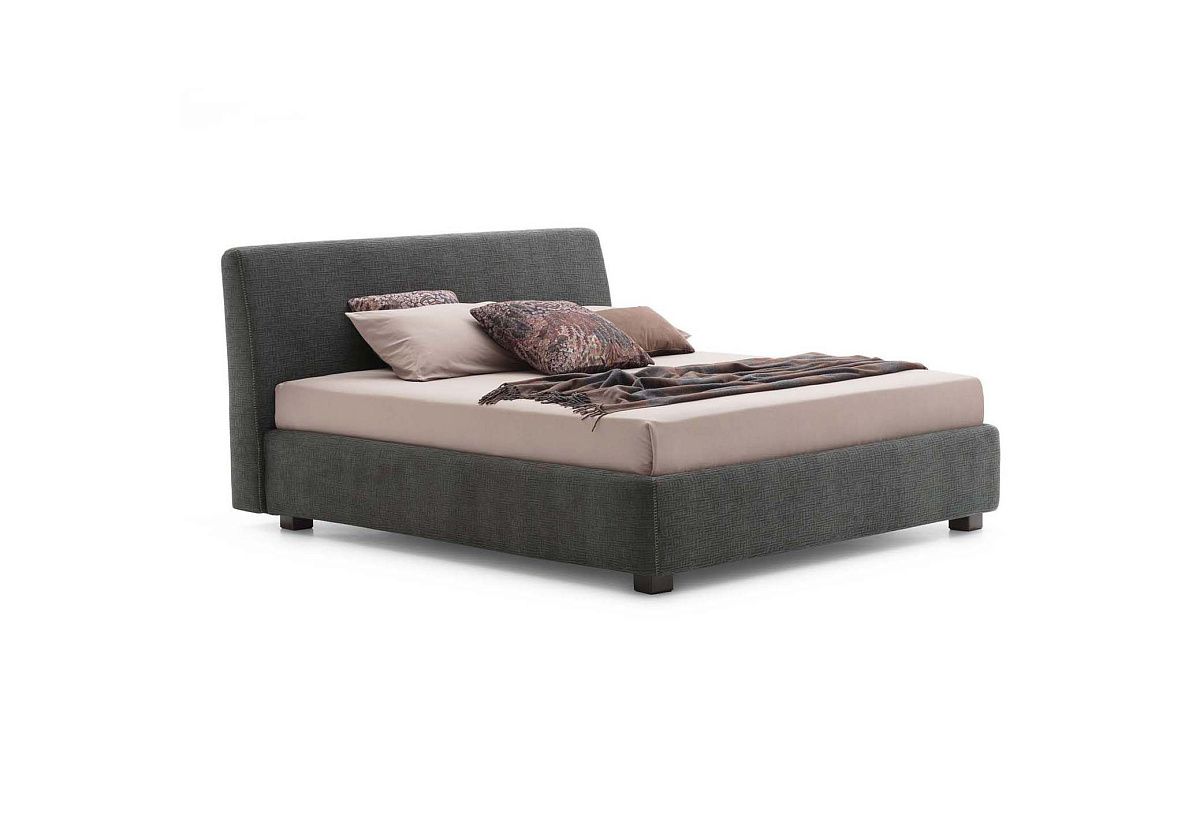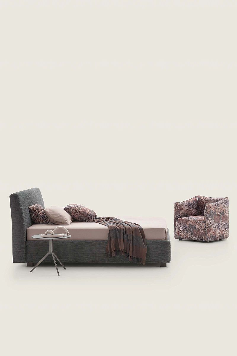 Кровать с гладким, простым изголовьем и видимой строчкой.