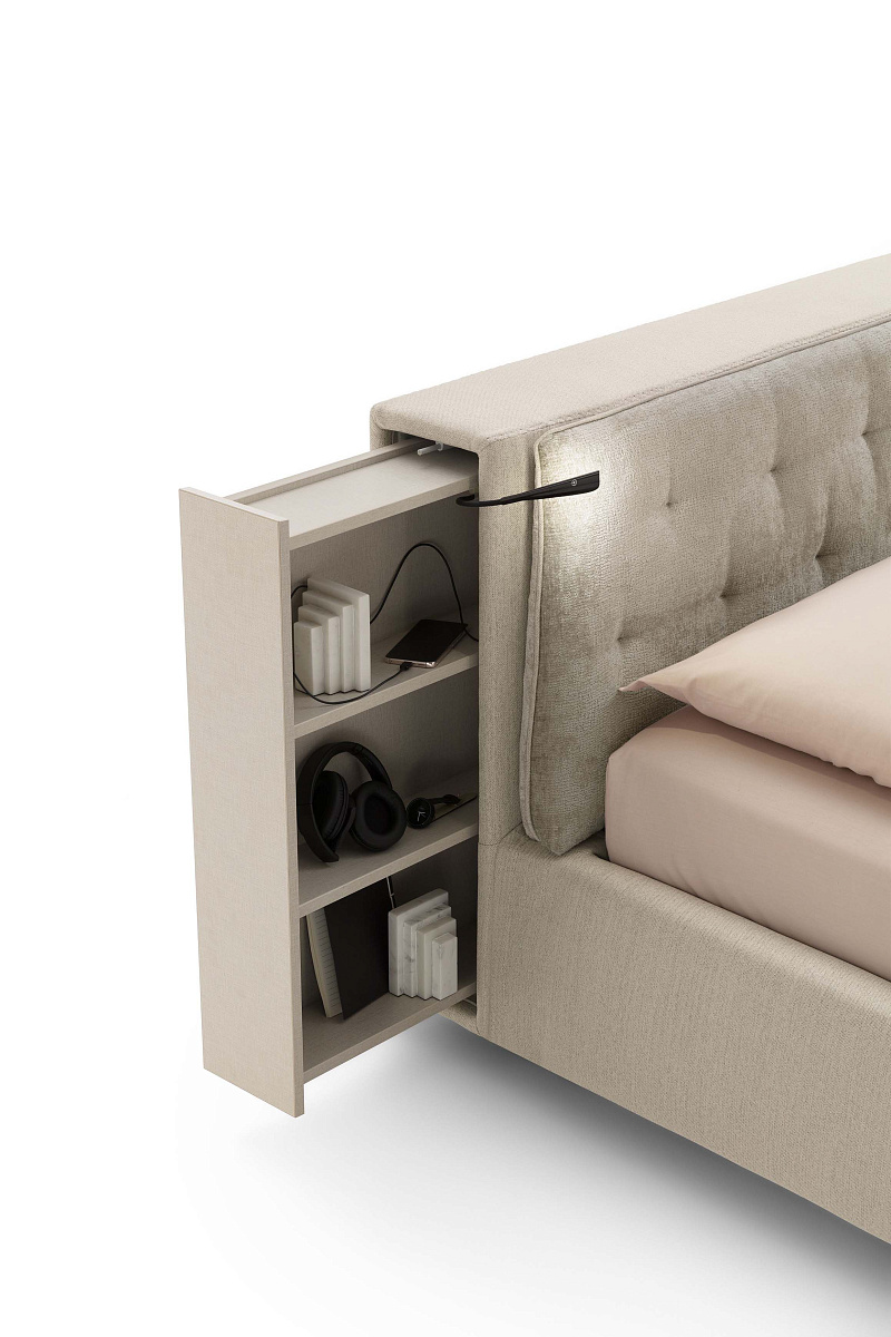 Кровать с мягкой обивкой, изголовье которой оснащено книжной полкой и выдвижной светодиодной подсветкой.