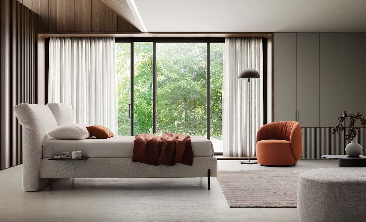 Кровать с мягким изголовьем, оснащенным регулируемым механизмом.