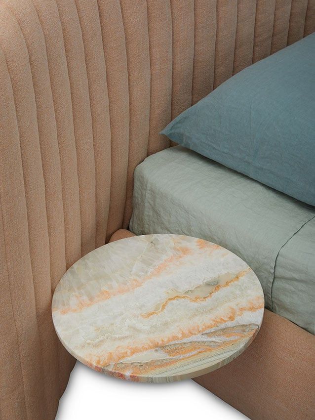 Элегантные опорные поверхности из благородного оникса, выполняющие функцию прикроватного столика, можно переставлять по периметру сомье, удовлетворяя различные потребности.