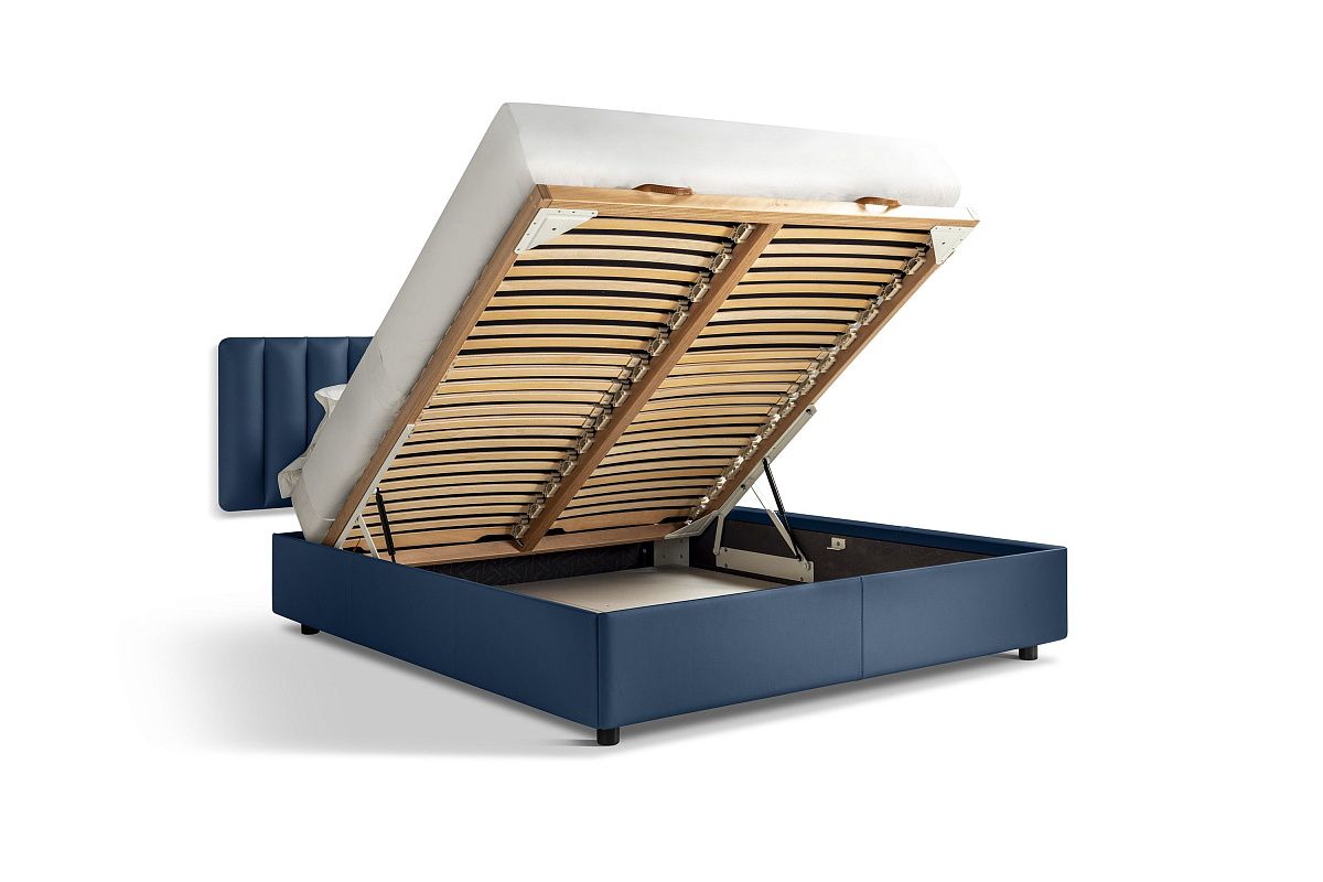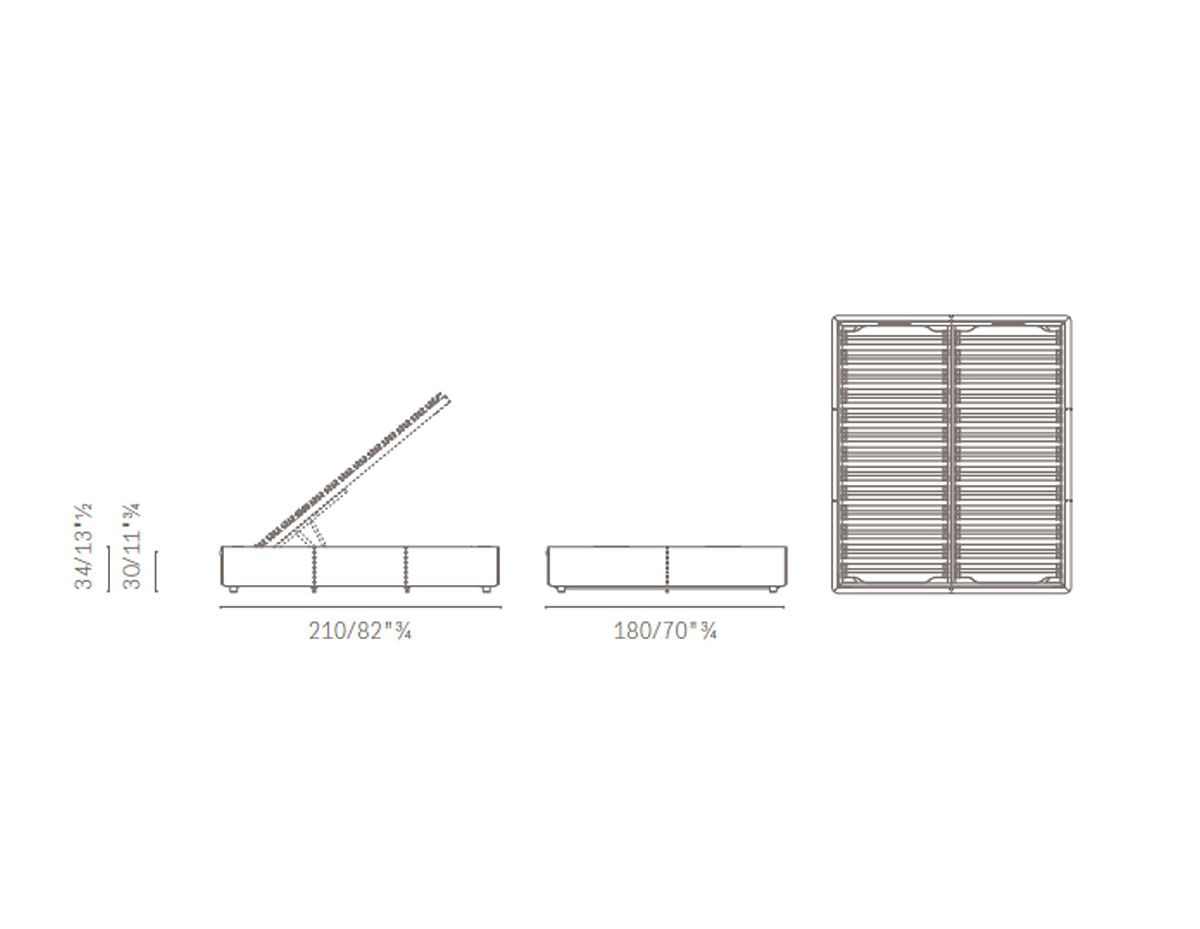 Каркас кровати Ferdinandea с ящиком для хранения изготовлен из тополиной фанеры с наполнителем из лёгкого пенополиуретана, обитого кожей Pelle Frau® с изящной строчкой в тон. Цилиндрические ножки изготовлены из окрашенного в чёрный цвет металла. Опорная поверхность отсека для хранения изготовлена из ДСП с необработанным покрытием, ламинированного с обеих сторон меламиновой декоративной отделкой, имитирующей «лён» цвета экрю, с кромкой, соответствующей декоративной отделке. Подъёмный механизм для доступа к отсеку для хранения открывается одним движением с помощью двух кожаных ручек, расположенных по бокам изножья. Верхняя часть кровати поднимается в классическое откидное положение с помощью газовой пружины. Подъёмная система выдерживает матрас размером 170 x 200 см и весом до 45 кг. Кровать Ferdinandea с ящиком для хранения можно дополнить мягким изголовьем с кожаной обивкой, выполненным в том же стиле, – воплощением превосходного мастерства, отличающего всю продукцию Poltrona Frau, и гарантирующим максимальный комфорт. Изголовье доступно в двух вариантах: с вертикальным или горизонтальным геометрическим узором и прострочкой в тон. Изголовье Ferdinandea имеет каркас из берёзовой фанеры, покрытой слоем пенополиуретана и полиэстеровой ваты, и обито тканью Pelle Frau® с изящной строчкой в тон, образующей геометрический узор, доступный в двух вариантах: горизонтальном или вертикальном. Задняя часть изголовья Ferdinandea обтянута чёрной тканью и крепится к стене с помощью байонетного крепления из матово-чёрного окрашенного металла.