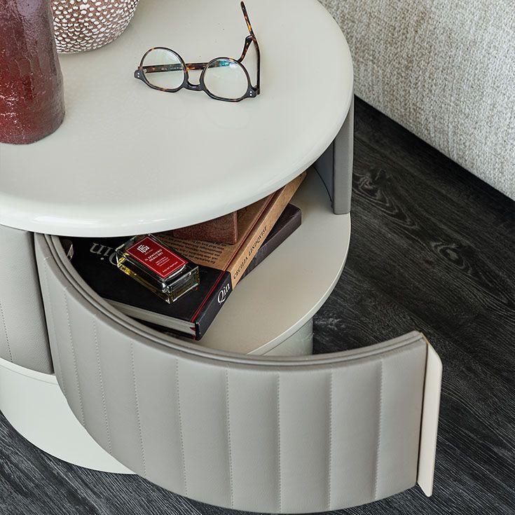 Контраст между естественной матовостью кожи и глянцевой отделкой столешницы, подчеркнутой бликами закругленной кромки, позволяет получить тумбочку с современным дизайном, интригующим и соблазнительным.