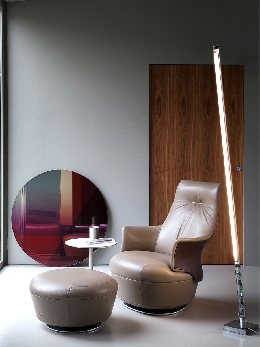 Каркас пуфа Assaya выполнен из выдержанного бука с эластичными ремнями. Основание — окрашенная стальная пластина цвета алюминия. Пуф доступен в тканевой или кожаной обивке Pelle Frau®.