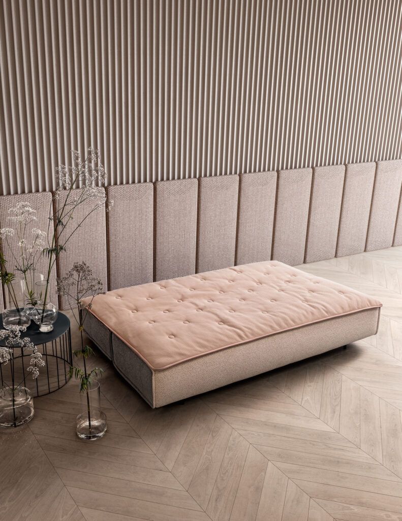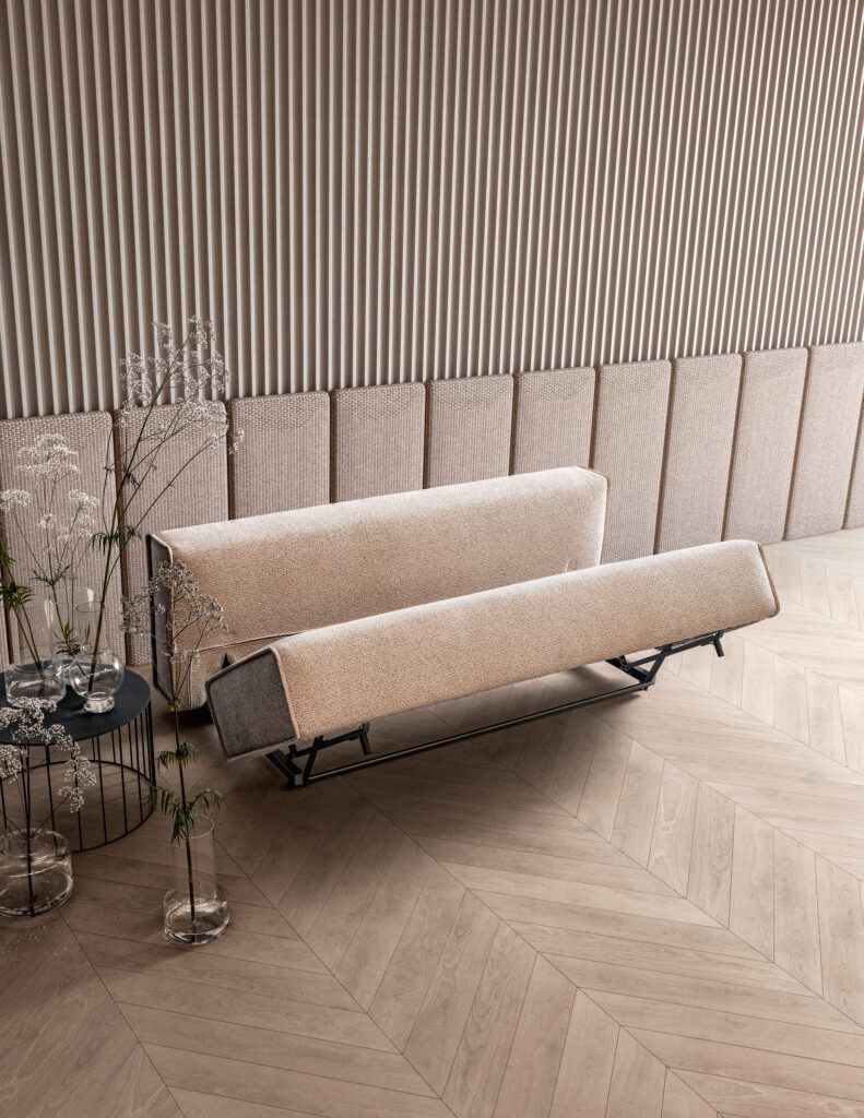 Диван-трансформер с элегантным дизайном, сочетающим стиль и функциональность.Благодаря инновационной системе он легко трансформируется в удобную кроватьс дополнительным топпером.