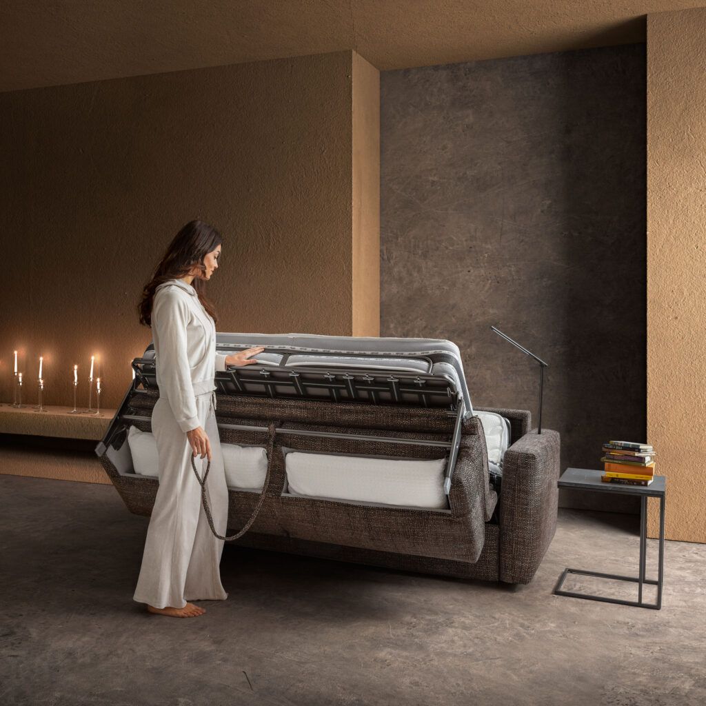 Раскладной диван-кровать с быстрораскладывающимся механизмом,в комплекте с матрасом высотой 21 см из недеформируемого пенополиуретана сосбалансированной поддержкой.