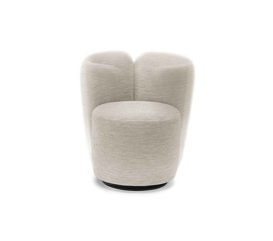 Основание вращающегося кресла с возвратным механизмом контрастирует с легкостью спинки, образованной двумя обитыми лепестками, которые кажутся подвешенными и вытянутыми вверх. Контраст между вертикальностью и пластичностью форм подчеркивается резьбой в металле, соединяющей части спинки с полностью обитым сиденьем. Эта деталь украшает, освещает и подчеркивает симметрию дизайна.