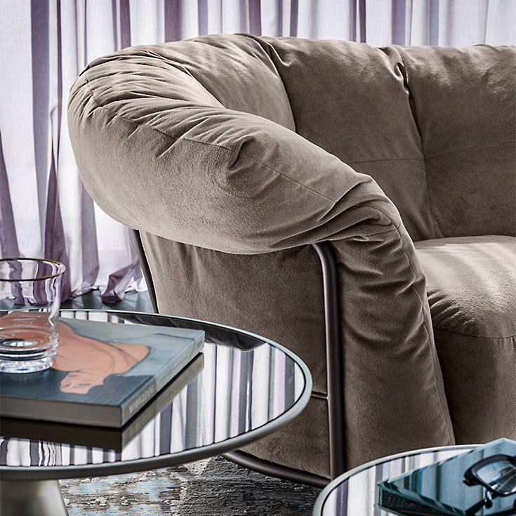 В трубчатую металлическую конструкцию помещена мягкая подушка, которая пышно лежит на каркасе, как вода, выливающаяся из стакана. Дизайн кресла для гостиной Margaret образует волну, не жидкую, но мягкую, которая вычерчивает форму спинки и переходит в широкий, обнимающий подлокотник.