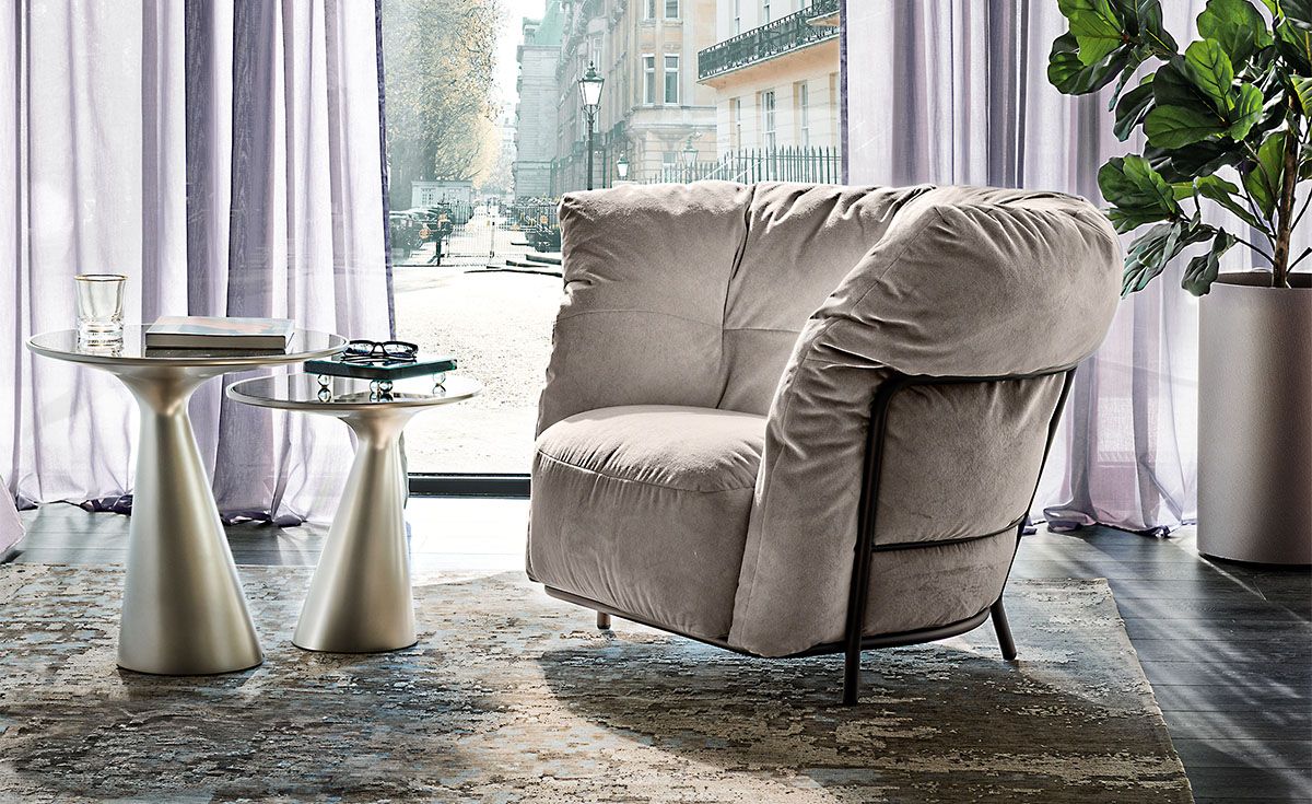 Широкое сиденье заключает в объятия и обнимает, создавая ощущение комфорта с первого взгляда. В жилом помещении Margaret может стать современным удобным креслом, предназначенным для повседневного использования. Это мягкое и уютное кресло создает настоящий уголок отдыха с выразительной эстетикой и помогает оформить гостиную в изысканном индустриальном стиле.