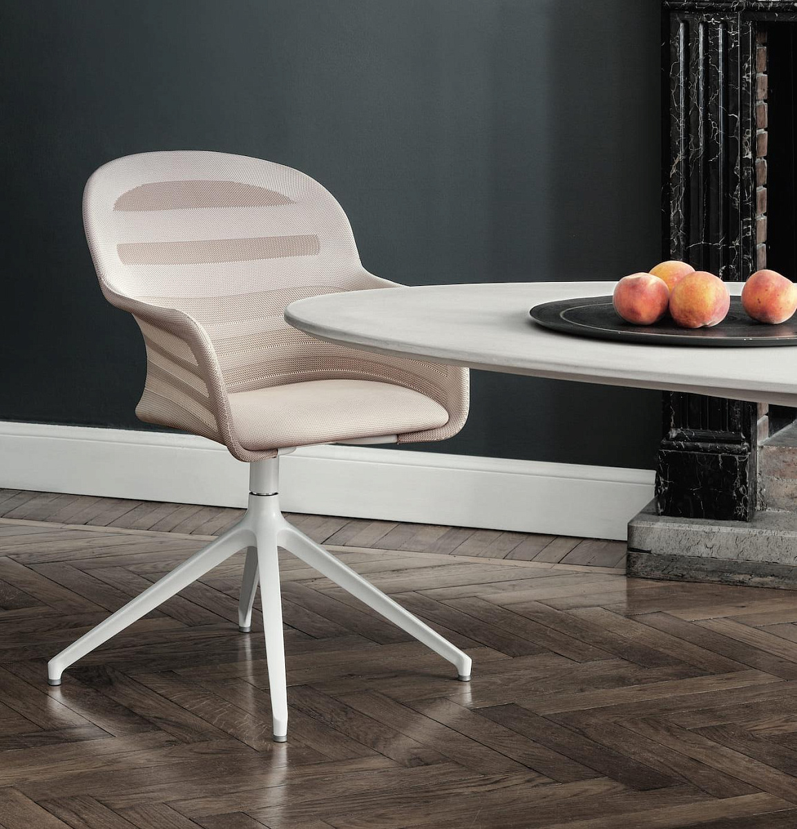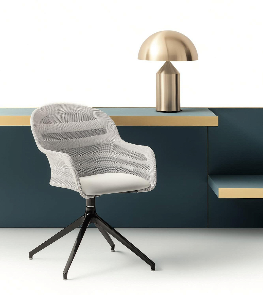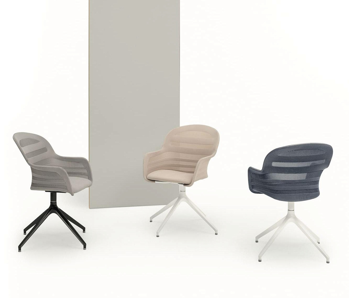 Стул с подлокотниками, с вращающейся структурой и колесиками из лакированной стали, спинка из обработанной эластичной сетчатой ткани и сидение из эластичной однородной сетчатой ткани или экокожи.