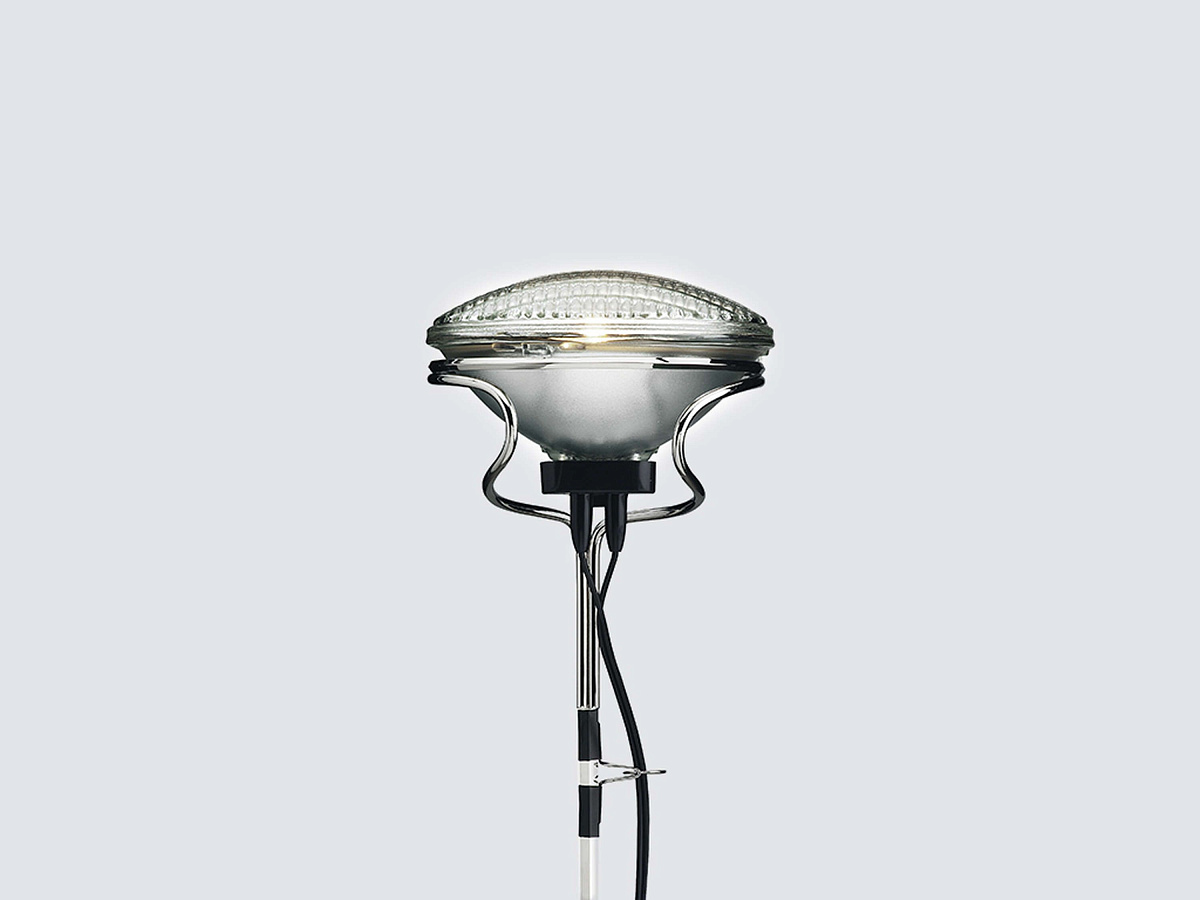 Торшер, обеспечивающий непрямое освещение. Угловое железо и формованная стальная основа, окрашенная в различные цвета. Шестиугольный стержень из никелированной латуни, регулируемый по высоте, с телескопической головкой. На кабеле имеется электронный диммер, позволяющий регулировать яркость света.