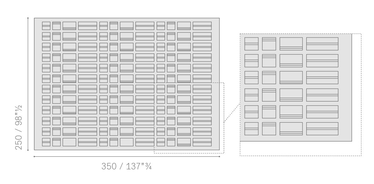 Ковёр DUO изготовлен вручную индо-тибетским узлом плотностью 90 000 узлов на кв. м. Повторяющийся узор из квадратов и прямоугольников прерывается шёлковыми нитями разных цветов. Состав: 80 % шерсть, 20 % шёлк. Доступен в двух цветовых решениях. Размер до 600 × 800 см возможен по запросу. Логотип Poltrona Frau® и этикетка с составом расположены на нижней стороне ковра.