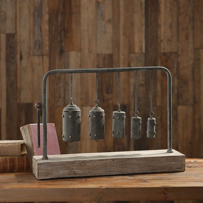 Настольная версия древнего китайского музыкального инструмента бяньчжун, в котором колокольчики имеют разный размер, что позволяет издавать разные звуки при ударе молотком. Инструмент установлен на подставке из ели.