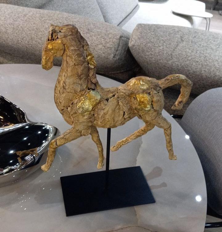 Скульптура лошади из состаренного коричневого дерева с едва заметными золотыми акцентами на черной железной подставке.