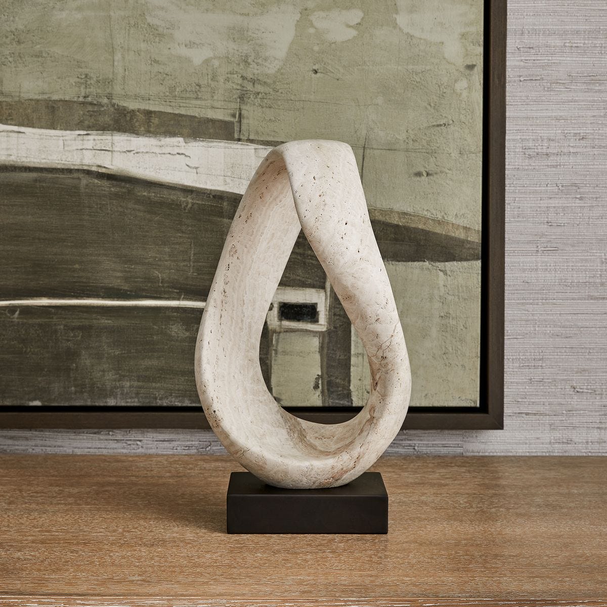 Бесконечная витая петля из светло-бежевого нешлифованного травертина установлена ​​на бронзированном металлическом основании. Каждый угол обзора создаёт уникальный ракурс, создавая интерес и интригу.