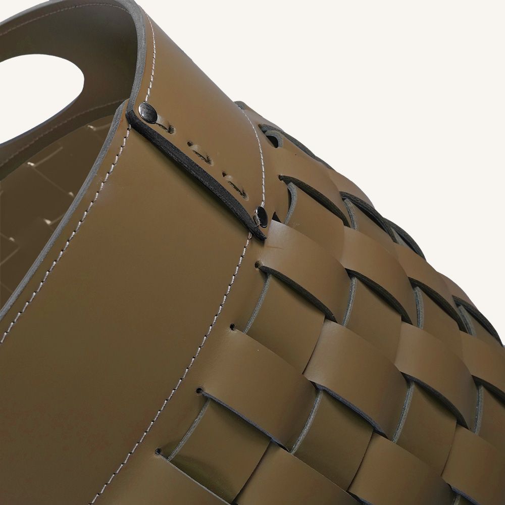 Корзина THESA, доступная в оливково-зеленом, тепло-коричневом и миндально-коричневом цветах, изготовлена исключительно из кожи, чтобы удовлетворить даже тех клиентов, которые предпочитают более мягкие контейнеры.
