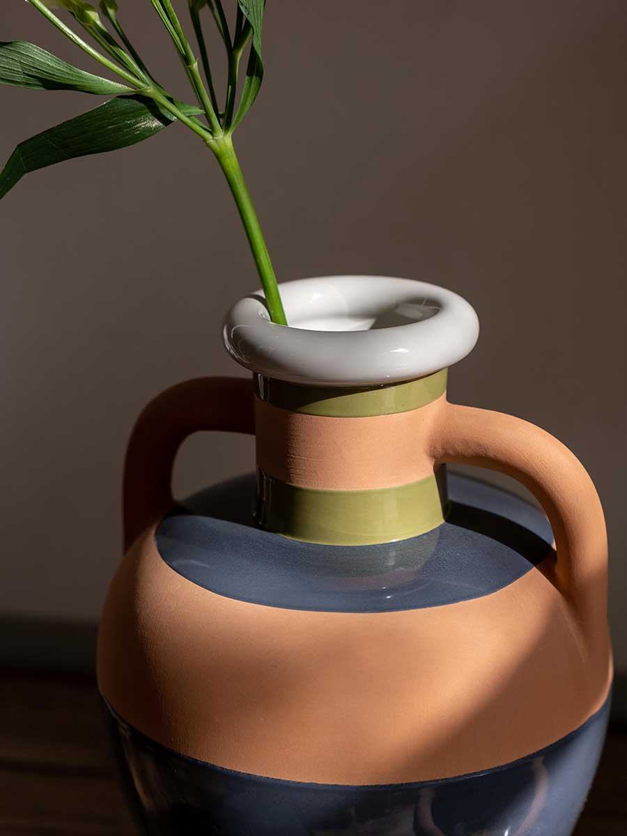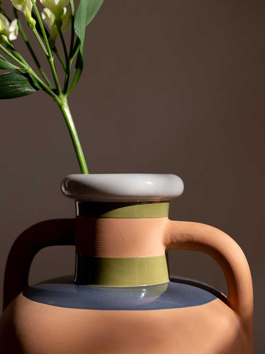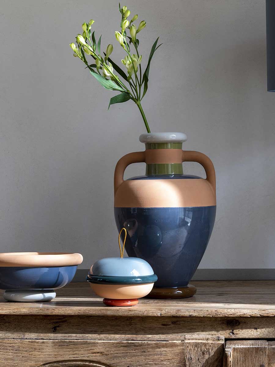 Керамическая ваза Ikiperu повторяет форму древнегреческого сосуда. Округлые стенки составляют горизонтальные полосы, выполненные из цветного глазурованного и неглазурованного керамогранита, создавая многосенсорный эффект. Ваза доступна в двух цветовых сочетаниях, вдохновлённых оттенками кожи Pelle Frau®.