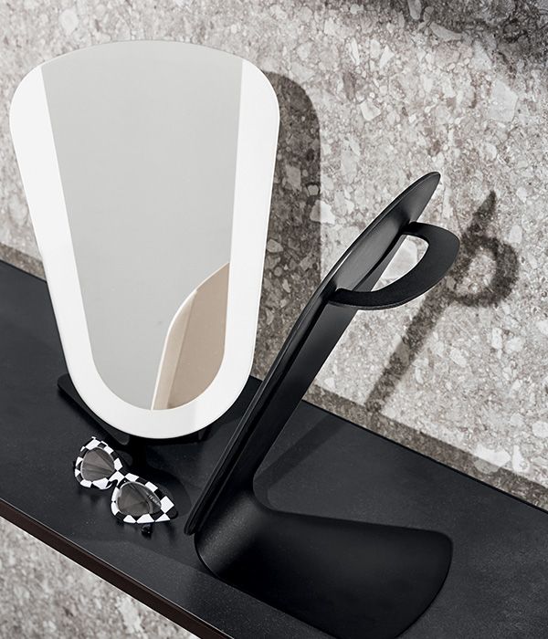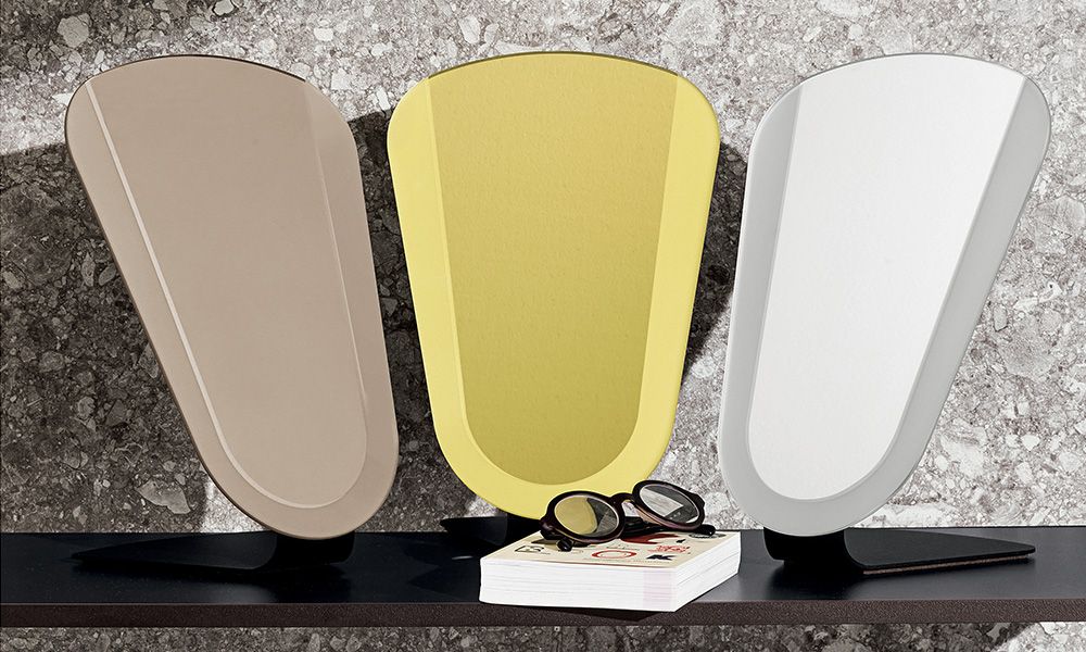 Настольное зеркало с шлифованной рамой, доступно в различных вариантах отделки. Каркас из чёрного металла с тиснением.