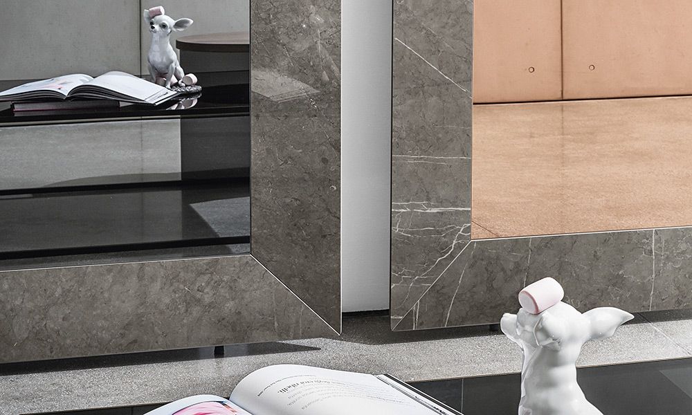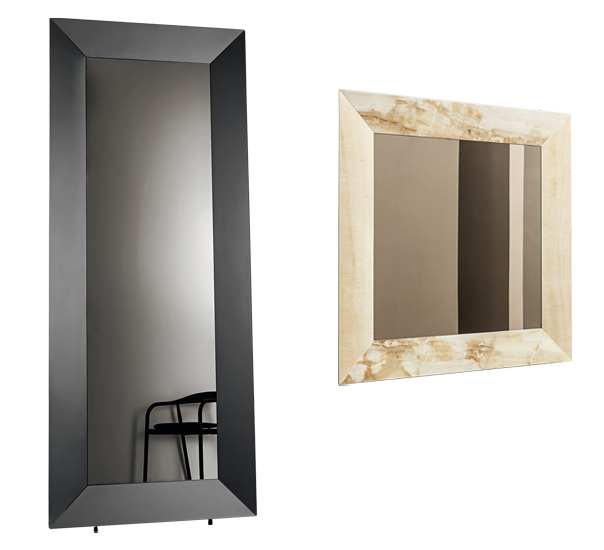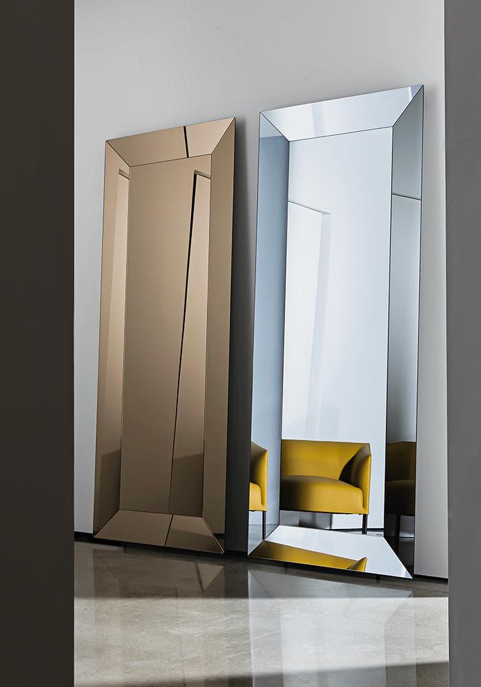 Напольное или горизонтальное/вертикальное подвесное зеркало с алюминиевой структурой. Центральное зеркало доступно в сверхлегком, дымчатом или бронзовом исполнении. Рама доступна из лакированного стекла, зеркала или керамики с различными вариантами отделки. Также доступно со светодиодной подсветкой сзади.