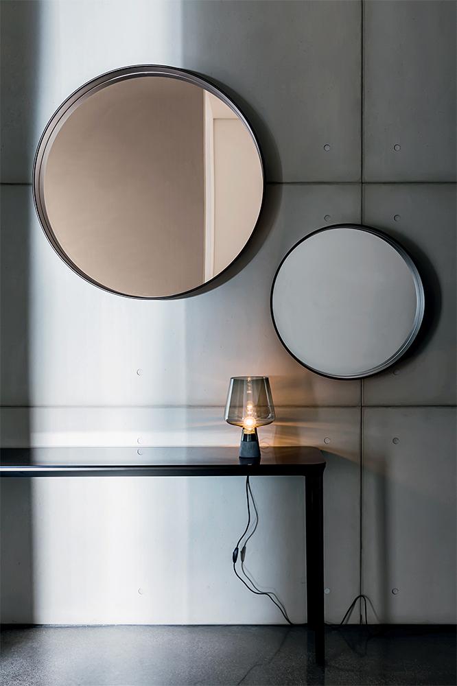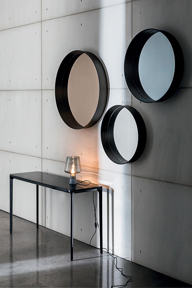Зеркало Horizon обрамлено алюминиевой рамой с тонким молдингом по краю. Отражающая поверхность также доступна с матовой отделкой, которая рисует линию горизонта, играя светом и пропорциями. Различные доступные размеры и поворотное крепление к стене позволяют создавать различные ситуации и композиции. Рама доступна в двух вариантах глубины и в четырёх лакированных отделках (кофейный, глиняный, белый и чёрный) и может комбинироваться с зеркалами с серебристой, дымчатой или бронзовой отделкой. Это разнообразие позволяет создавать разнообразные решения, расширяя горизонты оформления дома и общественных пространств.