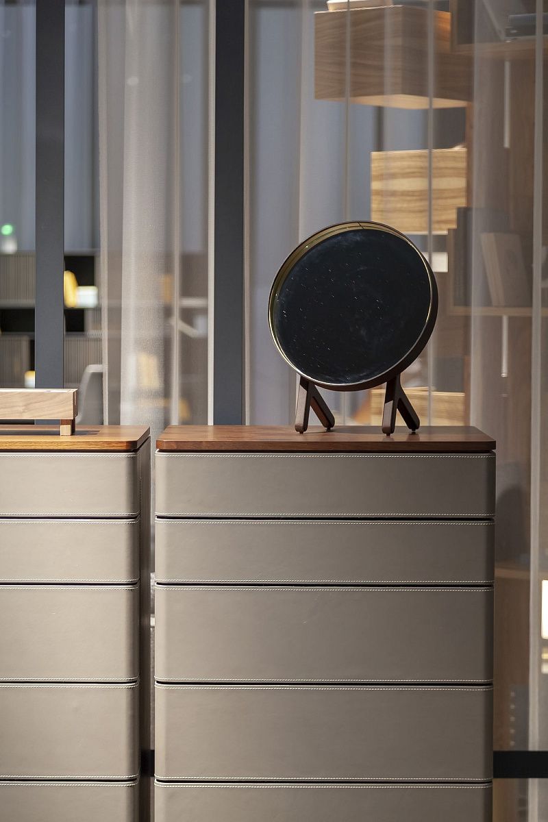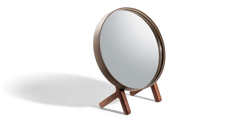 Зеркала Ren предназначены для дополнения интерьера сдержанными и уютными формами. Имеются круглые (Ø 430 мм) и овальные (280 × 1200 мм) варианты, а также отдельно стоящие и настольные экземпляры (Ø 310 мм). Рама зеркал обтянута кожей Saddle Extra, а задняя стенка сделана из берёзовой фанеры со шпоном ореха Canaletto. Настольное зеркало представляет собой круглый элемент, закреплённый на опорной конструкции с помощью крюка из матовой стали с латунным покрытием. Отдельно стоящий вариант — зеркало-вешалку для одежды, включающее овальное зеркало, низкую полку и два крючка для одежды. Настенное зеркало-вешалка для одежды состоит из перекладины из ореха Canaletto, к которой прикреплены круглое зеркало, круглая полка для ключей и два крючка для одежды (монтаж на стену не входит в комплект поставки). Туалетный столик включает круглое зеркало, овальную полку для ключей и столешницу со вторым встроенным отделением с откидной столешницей из кожи Saddle Extra и кольцеобразной латунной ручкой. Нижняя часть отделения обтянута вставкой из седельной кожи.