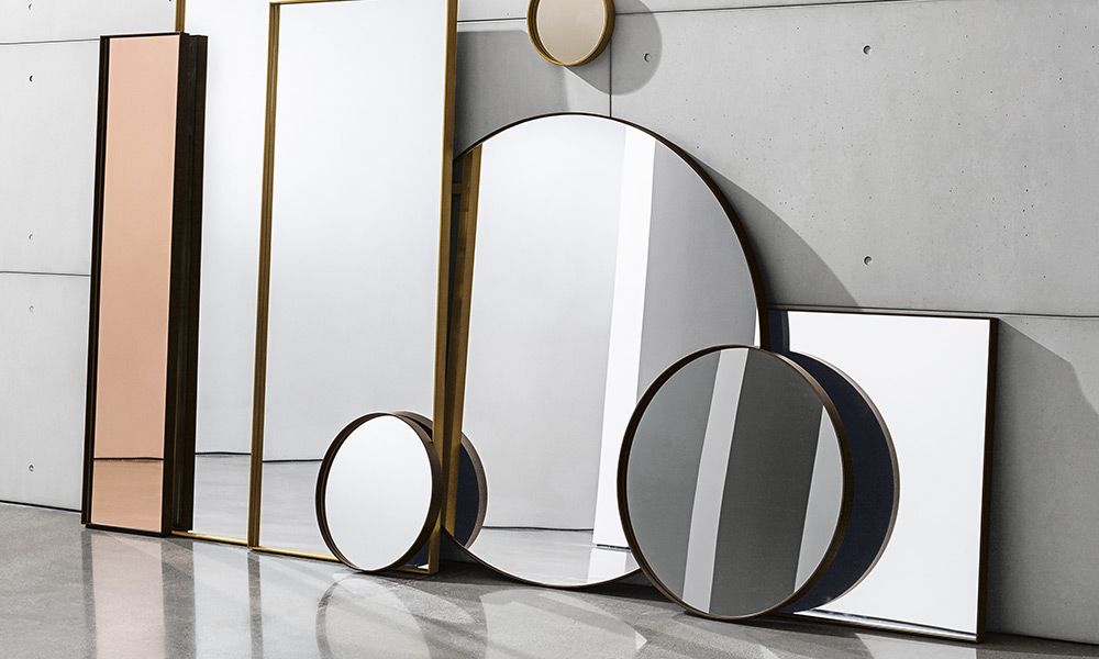 Напольное или горизонтальное/вертикальное подвесное прямоугольное зеркало в раме из лакированного металла, с отделкой цвета мокко или полированной латуни. Центральное зеркало доступно в различных оттенках.