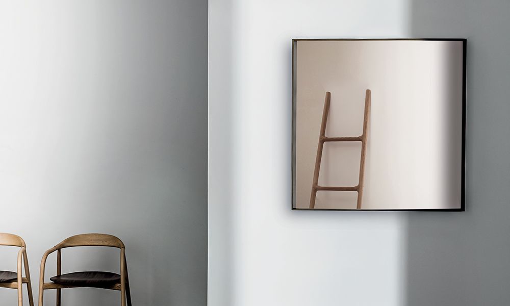 Квадратное подвесное зеркало в раме из лакированного металла, с отделкой цвета мокко или полированной латуни. Центральное зеркало доступно в различных оттенках.