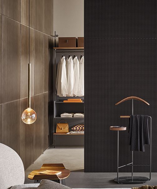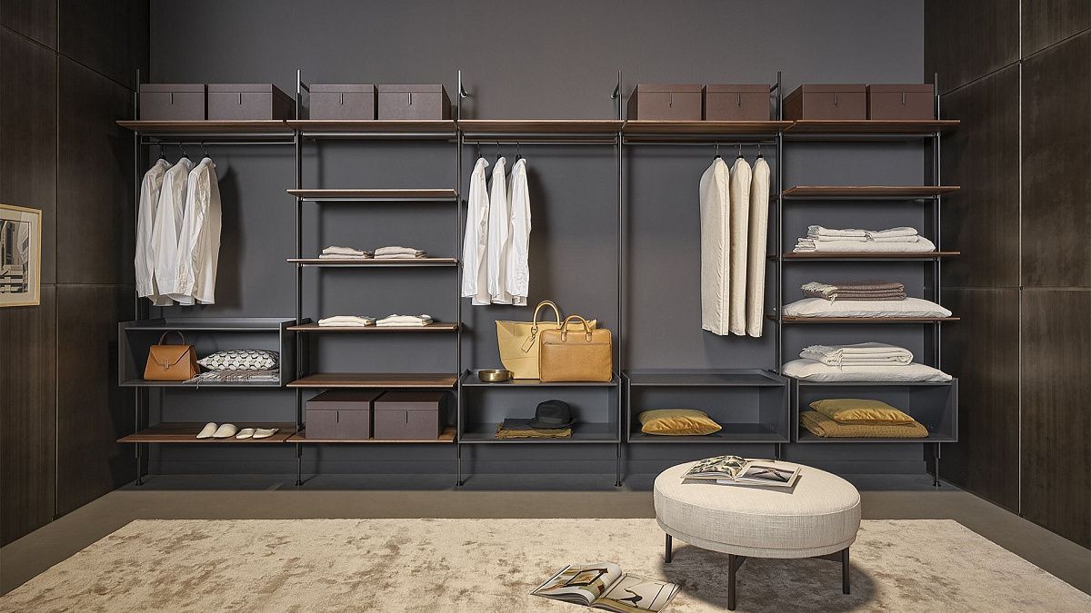 Гардеробная Roll, разработанным Dondoli e Pocci, получила вдохновение от одноименного стеллажа. Функциональный предмет мебели имеет четкие пропорции и выверенные размеры, а тщательно продуманные аксессуары создают идеальный сценический образ. Открытая гардеробная со стеновым креплением спроектирована для линейных решений. Конструкция выполнена из металла в отделке piombo, для полок используется лакированное дерево в отделке piombo или орех, придающий контрастность. Объемные деревянные контейнеры и компактные ящики для хранения, можно расположить в соответствии с потребностями.