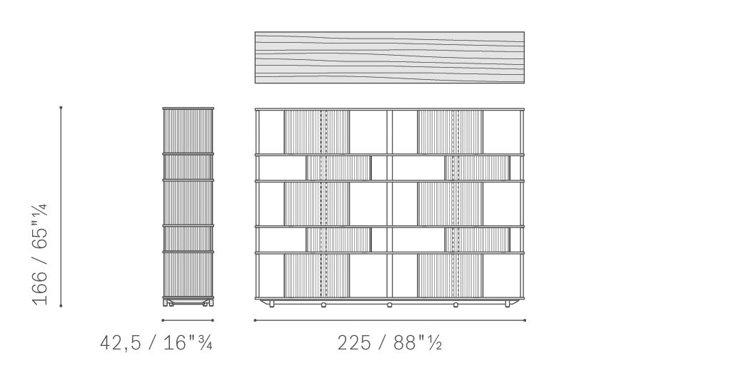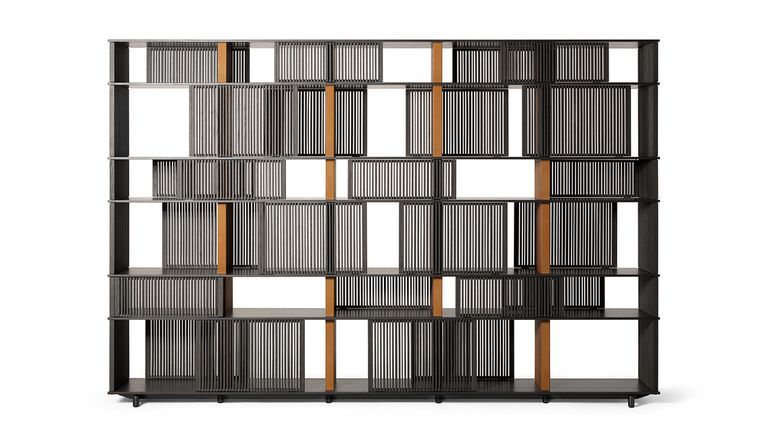 Горизонтальные элементы, по которым скользят решётки, изготовлены из ламината высокого давления (HPL), материала, который даже при очень тонком слое гарантирует устойчивость и прочность, а также покрыт натуральным дубовым шпоном с матовой свинцовой отделкой. Вертикальные стойки, обтянутые кожей, расположены на равном расстоянии друг от друга, чтобы придать предмету мебели ритм и подчеркнуть свободный эффект решёток. Каждая отдельная решётка — это кропотливый элемент корпусной мебели. Изготовленные из массива дуба, они перемещаются по направляющим, вырезанным в полках, и оснащены пластиковыми направляющими для уменьшения трения. Прочные дубовые планки нарезаются разной толщины, а затем склеиваются вручную по отдельности. Боковые стороны конструкции закрыты неподвижными решётками из массива дуба.