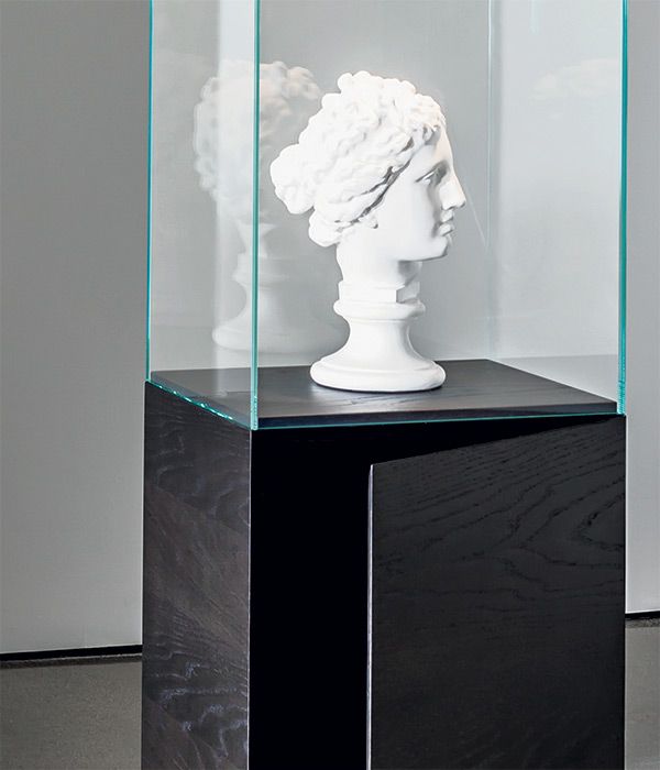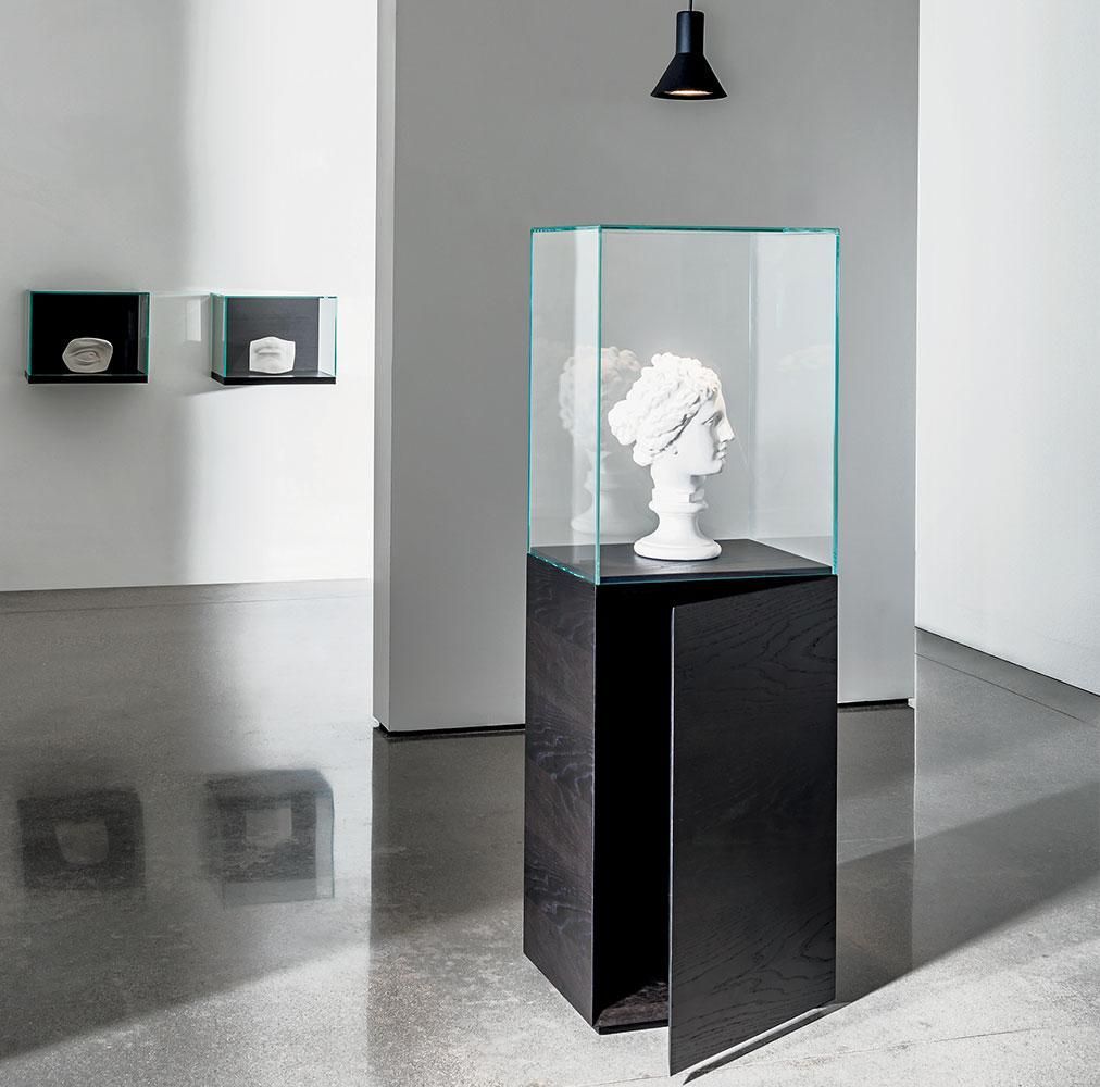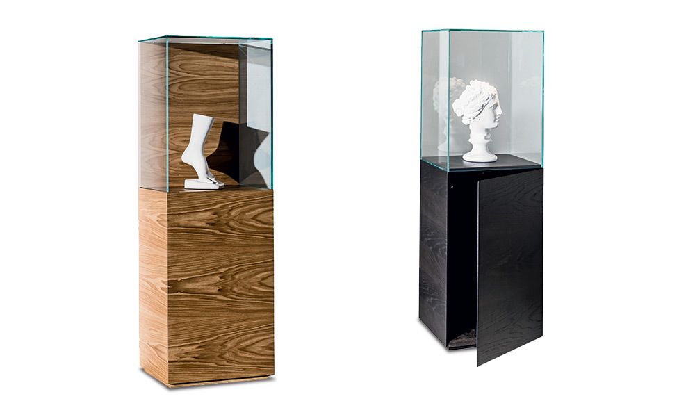 Корпус из шпонированного дубом дерева толщиной 30 мм, натурального или венге цвета. Закрытая столешница из сверхлёгкого прозрачного стекла. Доступен в вариантах для установки в середине комнаты или отдельно стоящей пристенной тумбы. Основание также может быть использовано в качестве удобного шкафа с открывающейся дверцей.