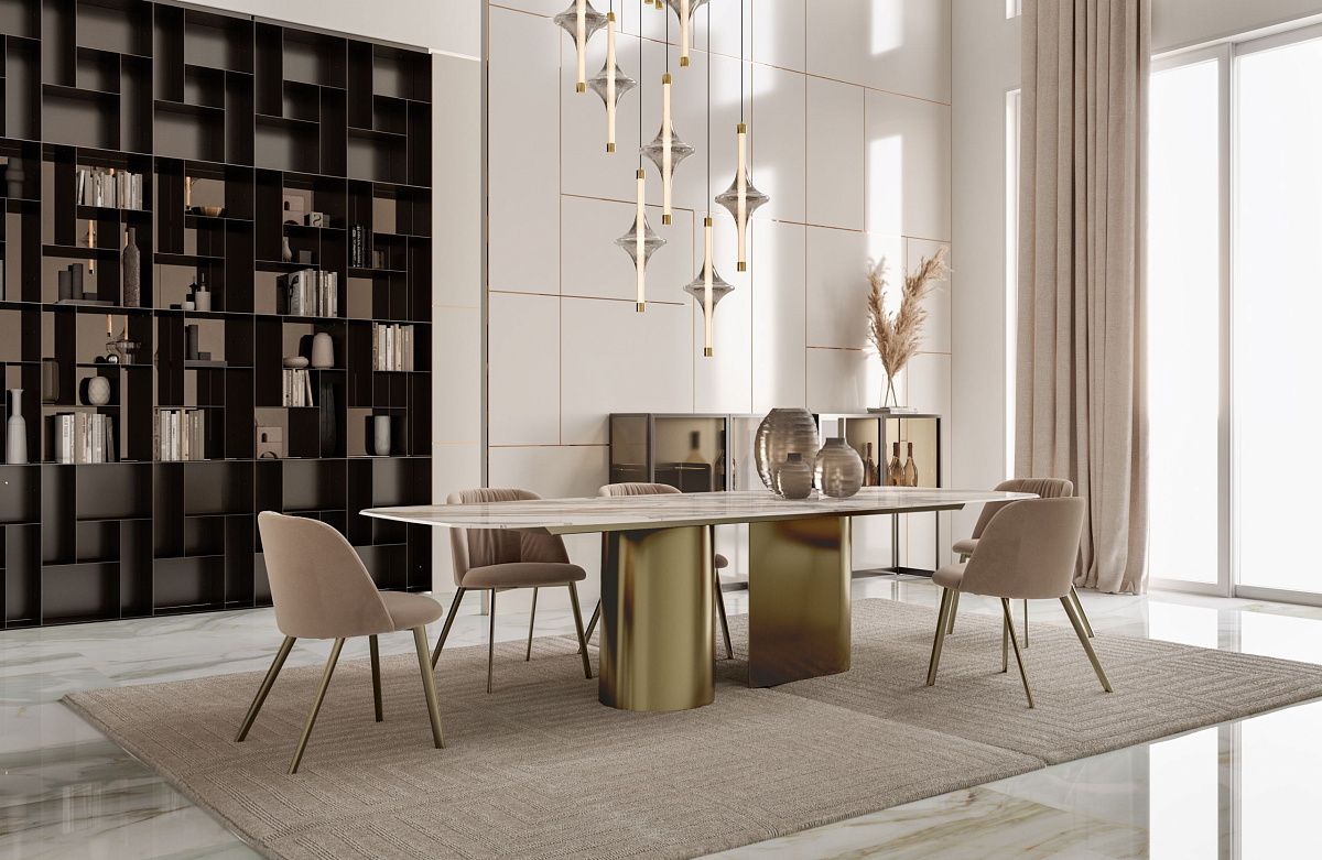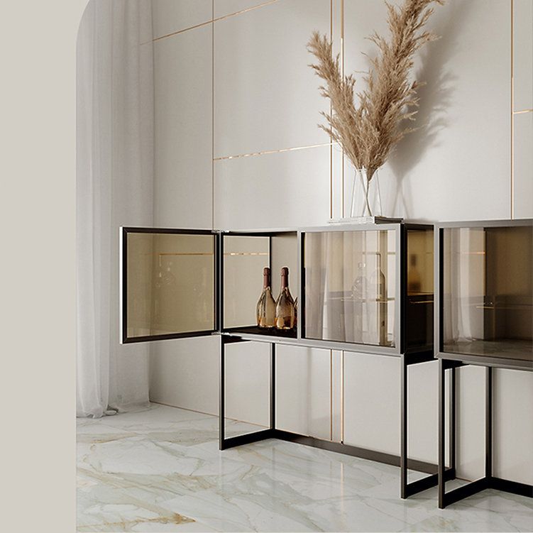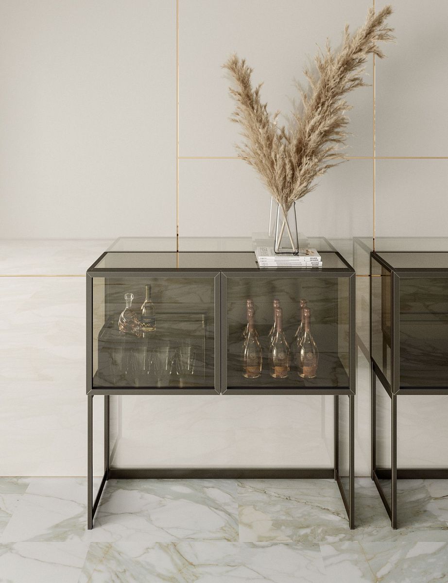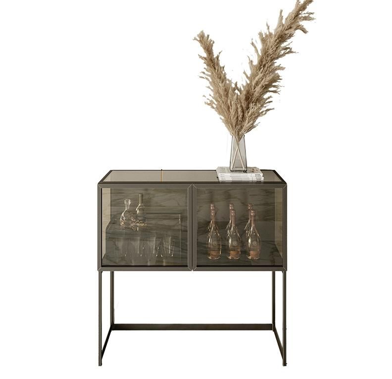Витрина ELVIS 15.55 имеет каркас из стали и алюминия, окрашенный в тёмный латунный цвет, что придаёт ей роскошный и изысканный вид. Распашные дверцы, боковины и верхняя стеклянная поверхность бронзового цвета создают гармоничный образ и подчёркивают стиль витрины. Нижний каркас тележки выполнен из стального каркаса, окрашенного в тот же тёмный латунный цвет, что обеспечивает прочность и долговечность конструкции.