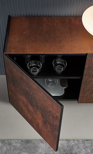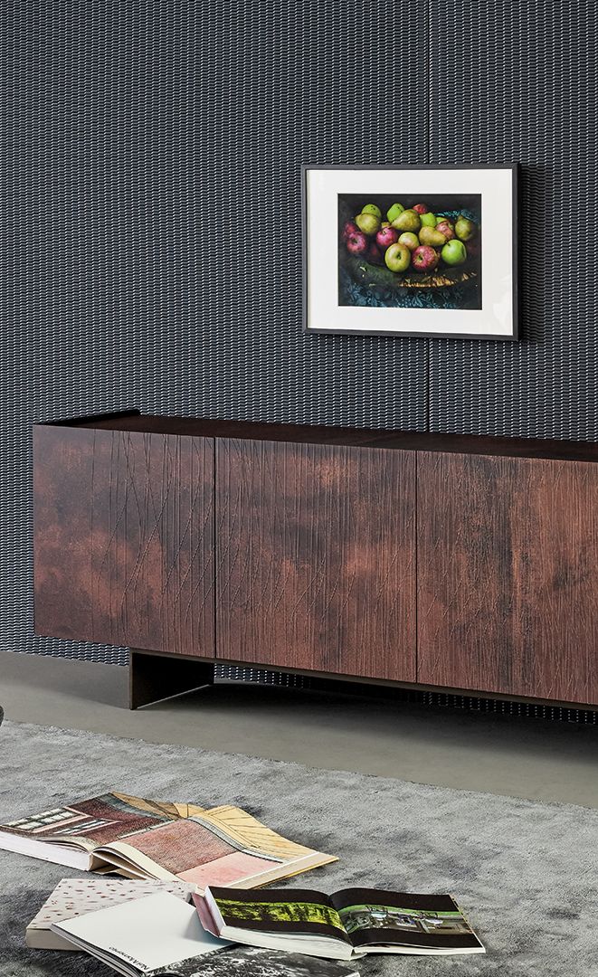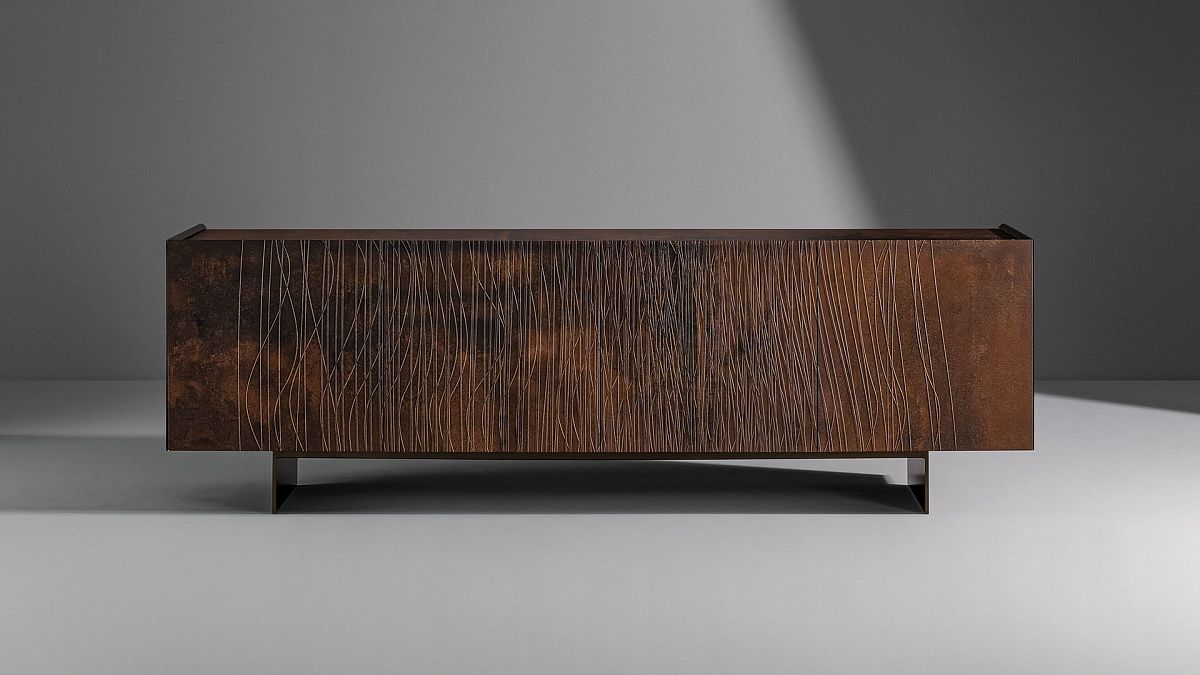 Лаконичный по форме и внешнему виду, которые подчеркиваются дизайном основания с двойным лезвием, современный деревянный сервант Blush удивляет окружающих стилем передней части, отмеченной легкими рельефными бороздками, которые создают впечатление “вибрирующей” поверхности. Прямые и изогнутые линии абстрактного узора, которые следуют друг за другом в изменяющемся ритме, отражают и в то же время подчеркивают естественную текстуру дерева, усиливая различные тональные оттенки и глубину светотени с помощью “трюка”, о котором говорит название аксессуара: это украшение утонченный эстетический прием, благодаря которому сервант приобретает темно-красный цвет.