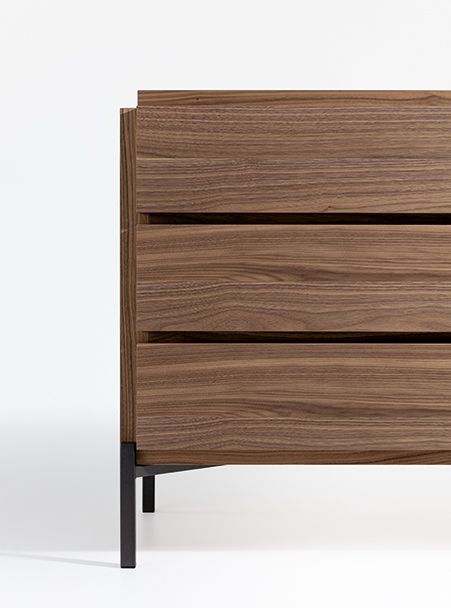 Элементы системы были спроектированы с акцентом на линейную графическую чистоту, создаваемую деревянными модулями, образующими выдвижные ящики, боковые стенки и столешницу, которые опираются на металлическую конструкцию, служащую основанием. Простая геометрия прикроватных тумбочек и комодов Groove подчеркивает их практическую функцию: в основном это связано с пазами на передней панели, которые особенно выделяются дизайном и служат незаметными ручками.
