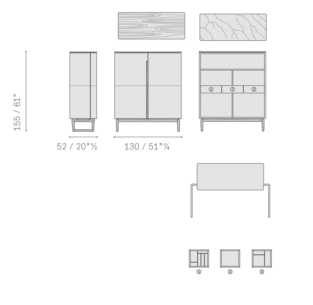Дверцы изготовлены из берёзовой фанеры и тополя, а внутренняя часть шпонирована шпоном ясеня цвета мокко для низкого шкафа Fidelio и очень светлым натуральным срезом клёна для высокого шкафа Fidelio. Окантовка дверец выполнена из массива ясеня цвета мокко.