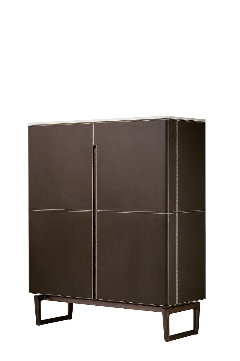 Для обивки боковин, дверец, внутренней части ящиков и, по запросу, задней стенки шкафа использована тонкая седельная кожа. На выбор предлагается строчка в тон или контрастная. Внутренняя часть мобильного бара Fidelio спроектирована так, чтобы освещаться при открывании дверец. Задняя стенка шкафа покрыта двумя бронзированными зеркалами.