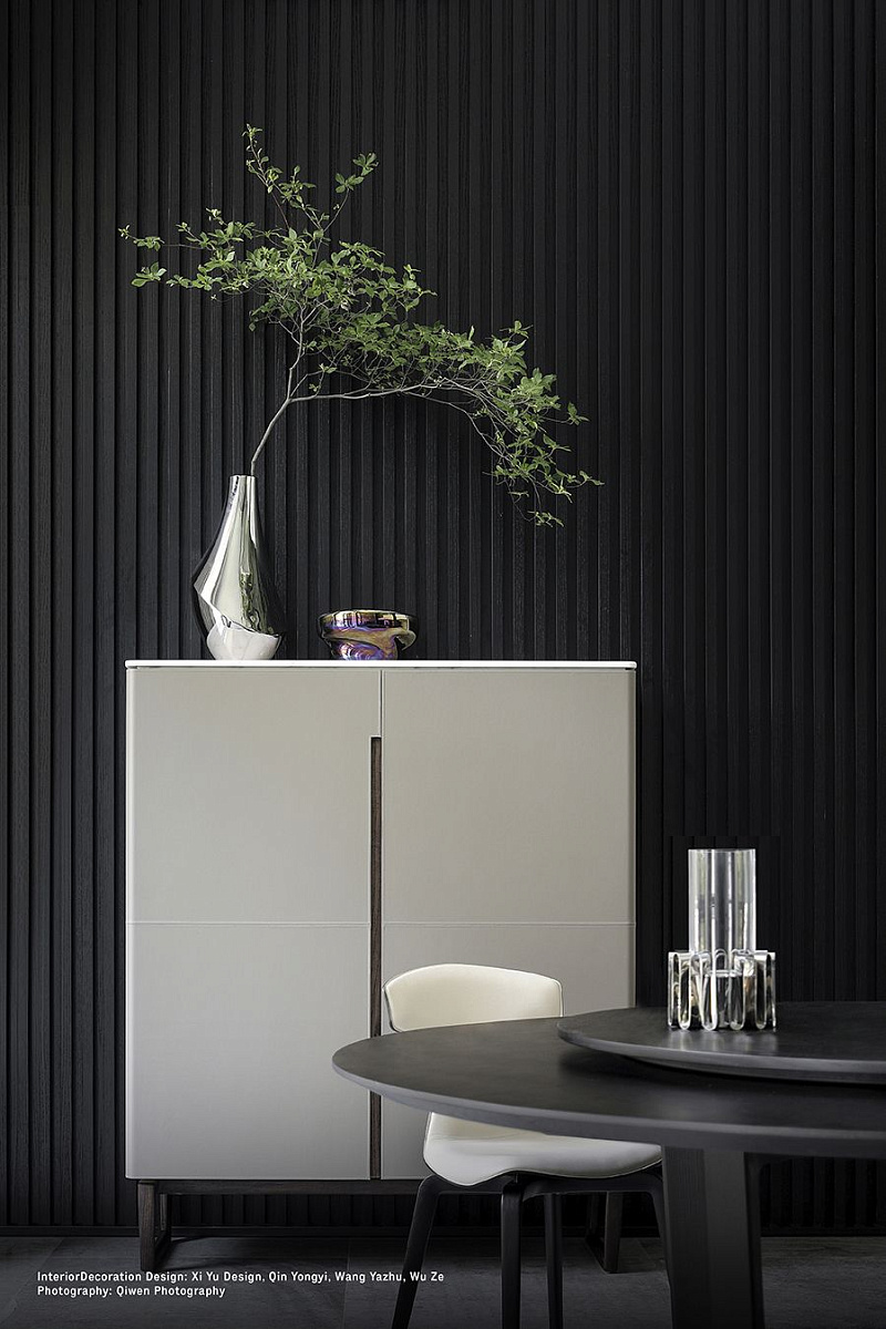 Коллекция включает в себя низкий шкаф, высокий шкаф и мобильный бар Fidelio. Несущая конструкция выполнена из массива ясеня и берёзовой фанеры, снаружи отделанной шпоном цвета мокко. Очень светлый натуральный клён придаёт интерьеру яркость.