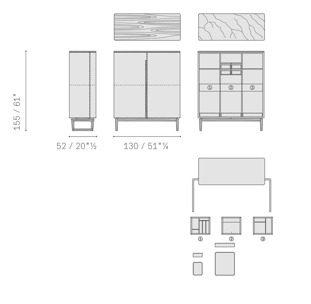 Дверцы изготовлены из берёзовой фанеры и тополя, а внутренняя часть шпонирована шпоном ясеня цвета мокко для низкого шкафа Fidelio и очень светлым натуральным срезом клёна для высокого шкафа Fidelio. Окантовка дверец выполнена из массива ясеня цвета мокко.