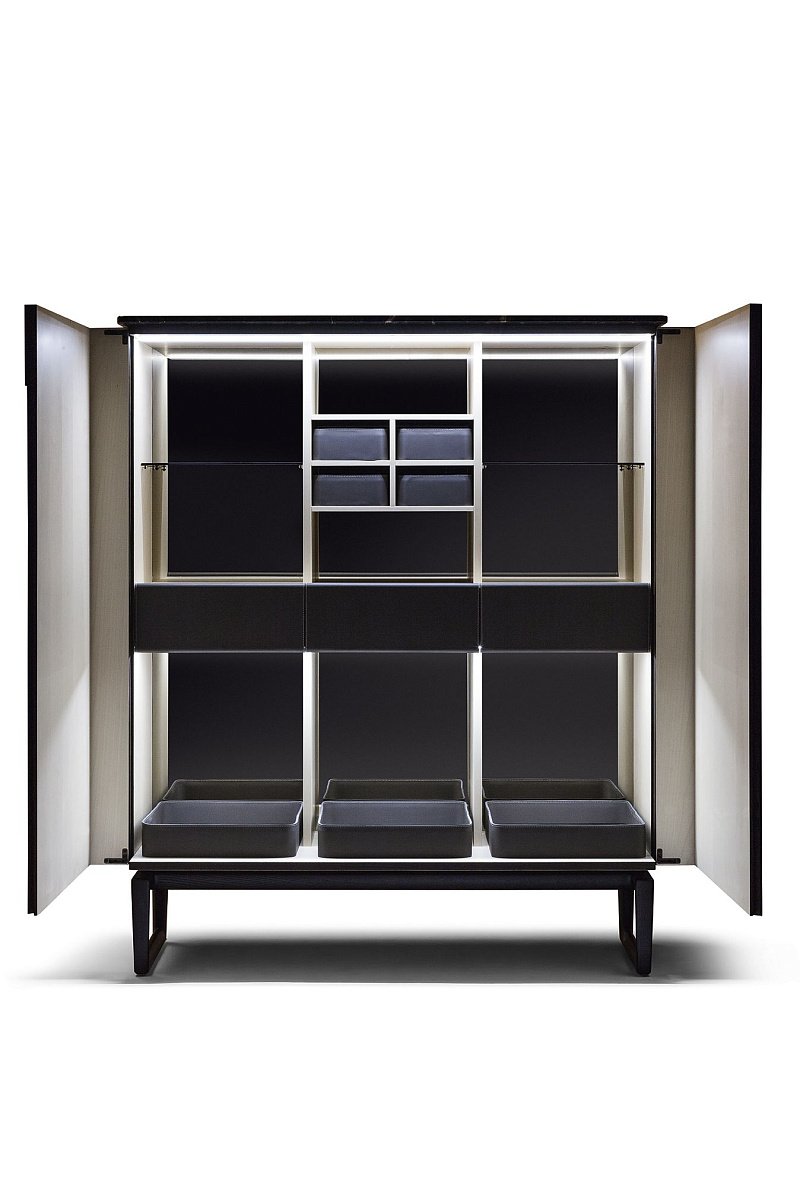 Для обивки боковин, дверец, внутренней части ящиков и, по запросу, задней стенки шкафа использована тонкая седельная кожа. На выбор предлагается строчка в тон или контрастная. Внутренняя часть мобильного бара Fidelio спроектирована так, чтобы освещаться при открывании дверец. Задняя стенка шкафа покрыта двумя бронзированными зеркалами.