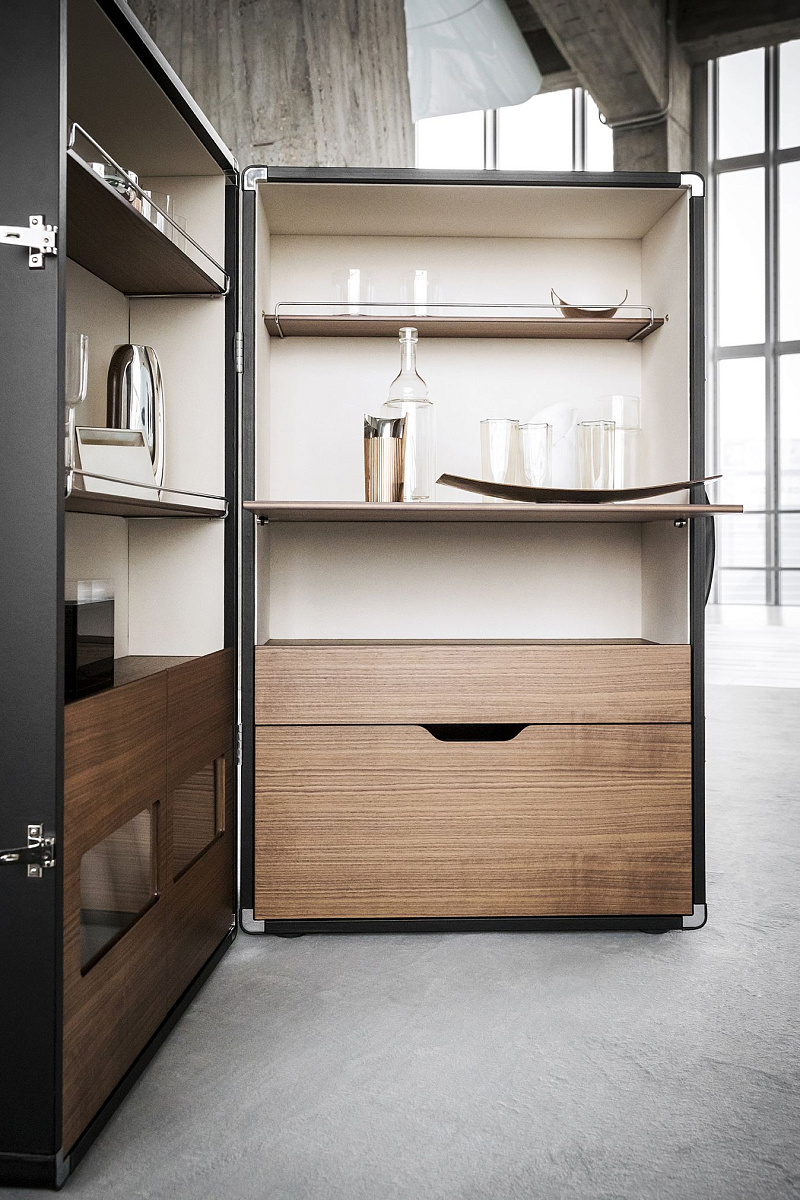 Полки и ящики выполнены из тополиной фанеры с отделкой из орехового шпона Canaletto. Отделения для стаканов и бутылок дополнены мини-поручнями из хромированного металла.