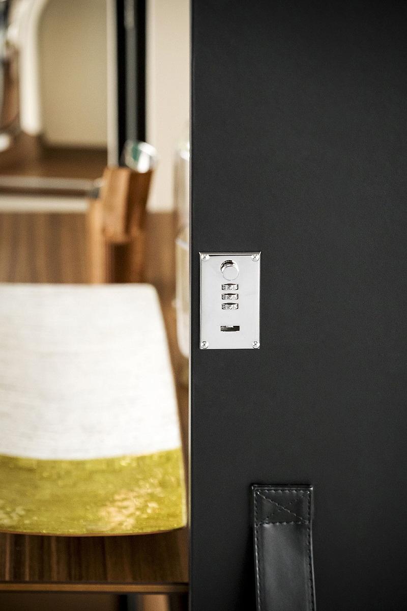 Ножки изготовлены из пластика: неподвижная часть оснащена заглушками, а открывающаяся — поворотными роликами. Пара замков-защёлок с комбинацией обеспечивают идеальное закрытие шкафа.