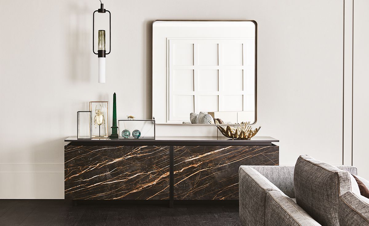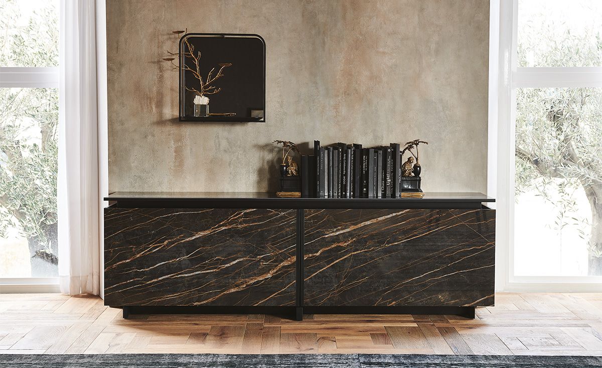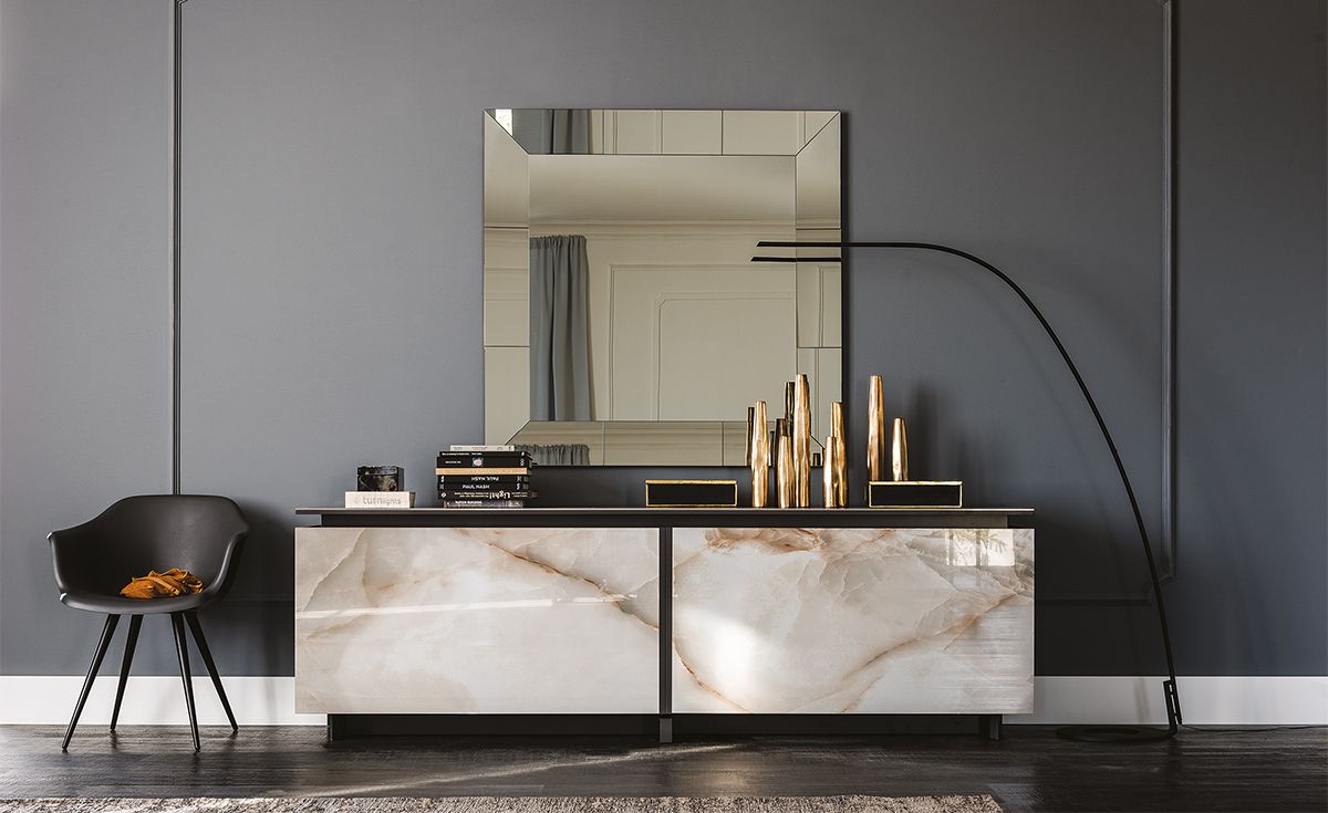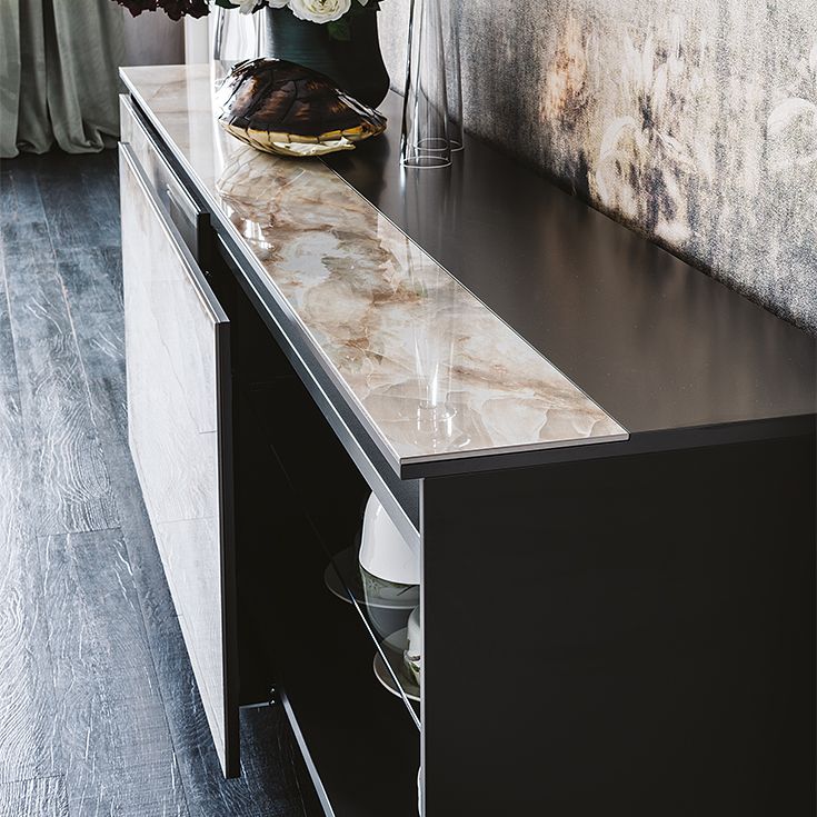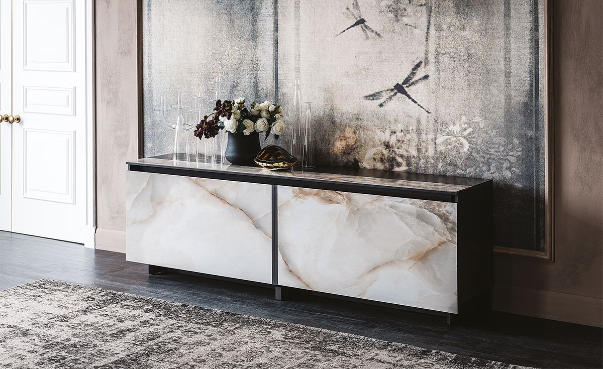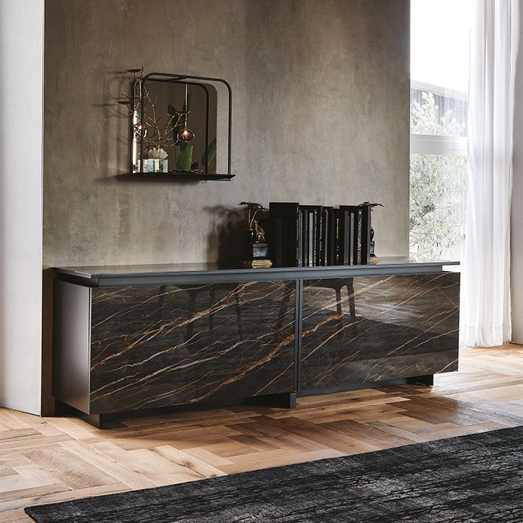 Драгоценная керамическая отделка Marmi украшает две двери и часть верхней части Europa Keramik, дизайнерского буфета, воплощающего суть стиля, подписанного Cattelan Italia. Этот комод из керамики, кажется, подвешен в гостиной, поддерживается стальной конструкцией с линейной формой, имеет компланарные раздвижные двери и внутренние стеклянные полки, идеально подходящие для максимальной функциональности и вместимости.