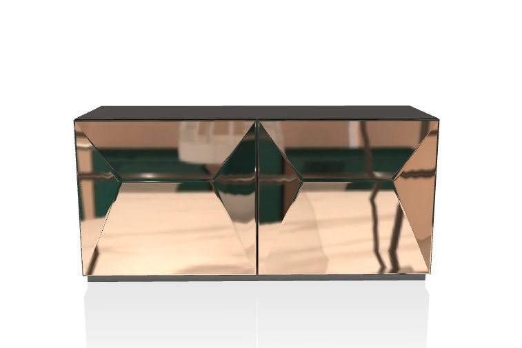 Комод с деревянной структурой, состоящей из распашных дверей, внутренних полок из прозрачного стекла; боковин из лакированного дерева и дверей из Зеркала бронзового и Зеркала дыматого. С цоколем или с ножками из стали на выбор.