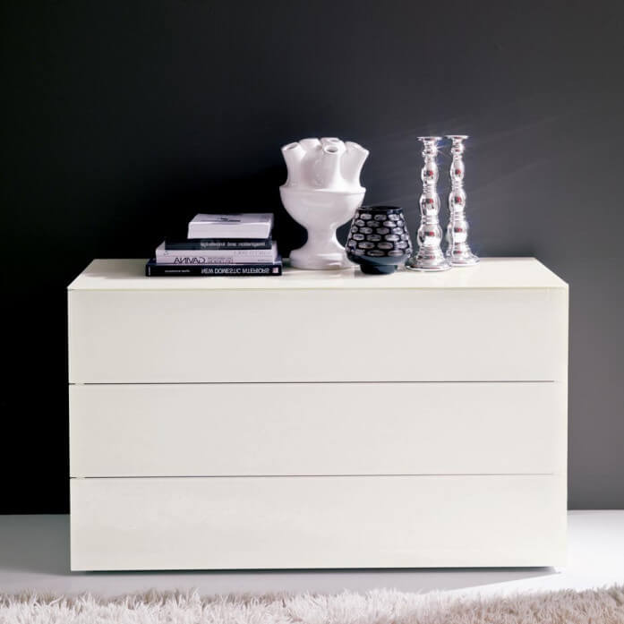 Программа комодов и тумбочек со структурой из дерева в матовом лаке, топ и фасады ящиков из глянцевого стекла.