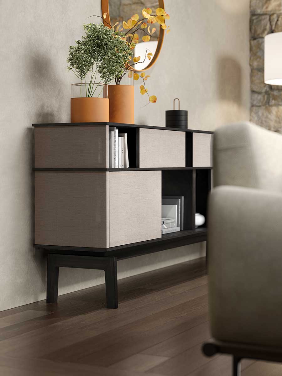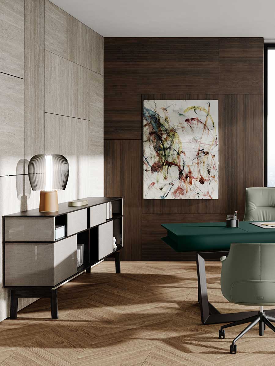 Панели скользят по невидимым горизонтальным направляющим, создавая постоянно меняющиеся последовательности. В Lloyd Tex самые передовые технологии сочетаются с традиционными материалами, такими как дерево, в тонком балансе между различными видами материалов.