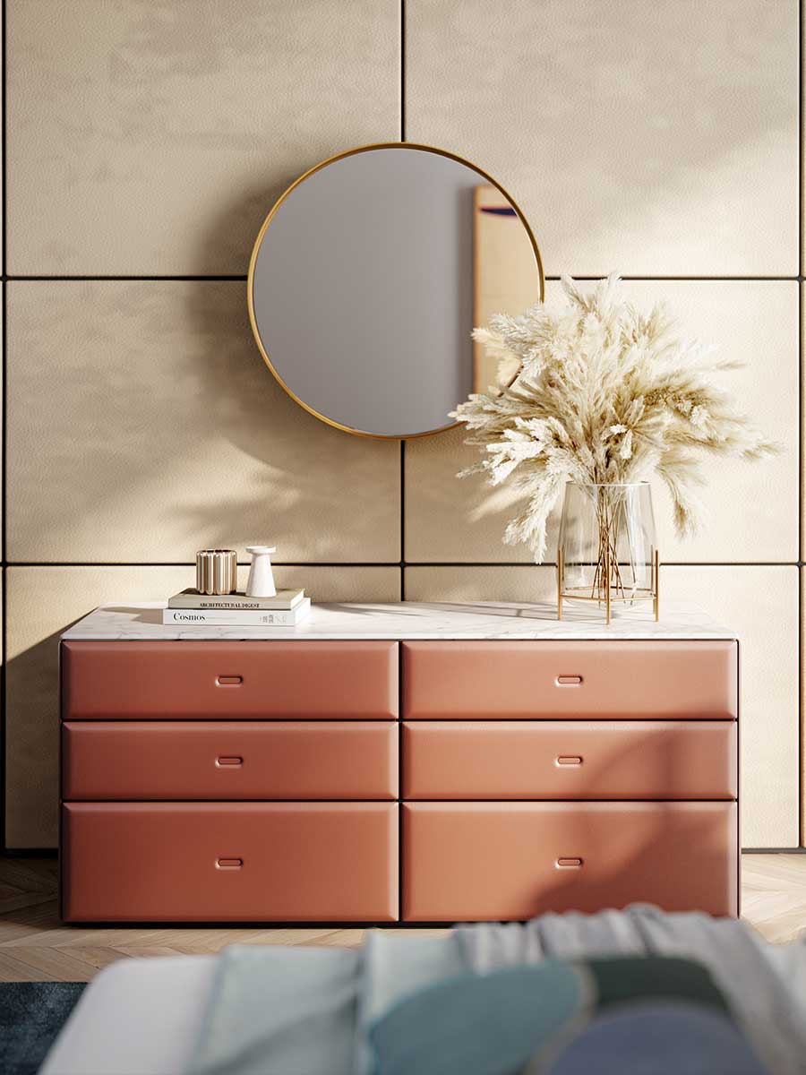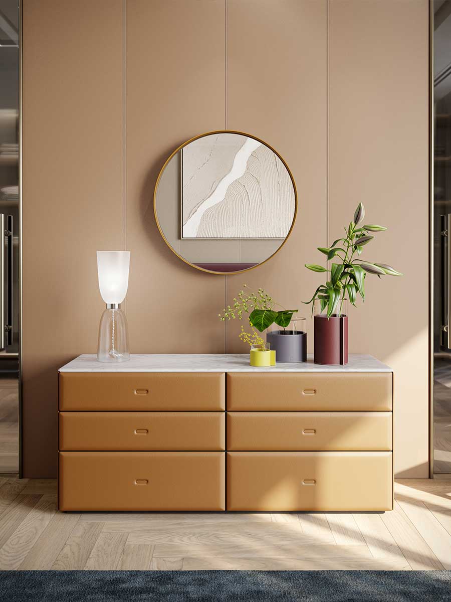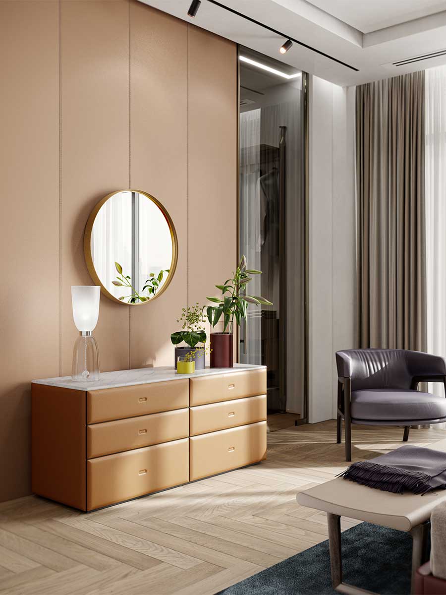 Каждый аксессуар Moondance обтянут вручную, словно уникальный предмет. Покрыт кожей Pelle Frau® и дополнен легкой мягкой подкладкой, приятной на ощупь и красивой на вид. Столешница из теплого ореха Canaletto и натурального золотистого мрамора Calacatta с полуполированной отделкой. Лотки из массива дерева позволяют удобно хранить любые предметы, включая галстуки и ремни. Шкатулки для часов и колец обтянуты бежевой алькантарой®. Задняя стенка доступна в варианте со шпоном ореха Canaletto или с обивкой из кожи Pelle Frau®. Каркас ящиков из МДФ с распиленным шпоном ореха Canalleto, фасады из березовой фанеры. Обивка из кожи Pelle Frau® дополнена пенополиуретаном. Стальные ножки с черными пластиковыми защитными колпачками регулируются изнутри.
