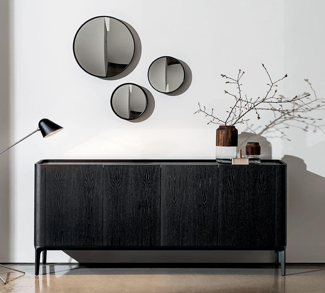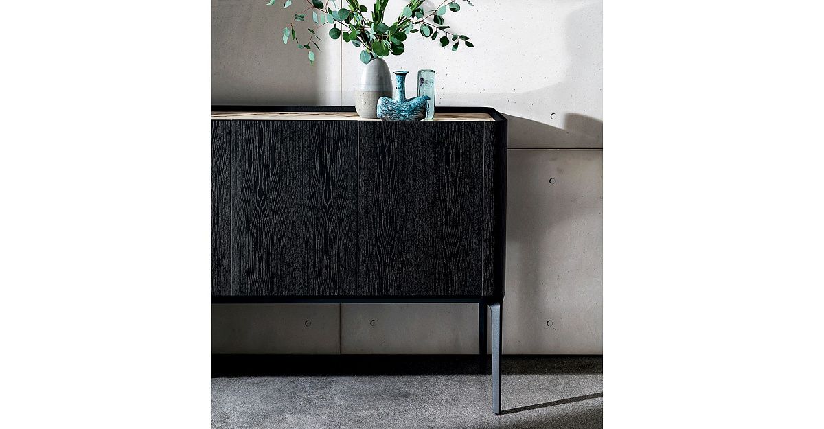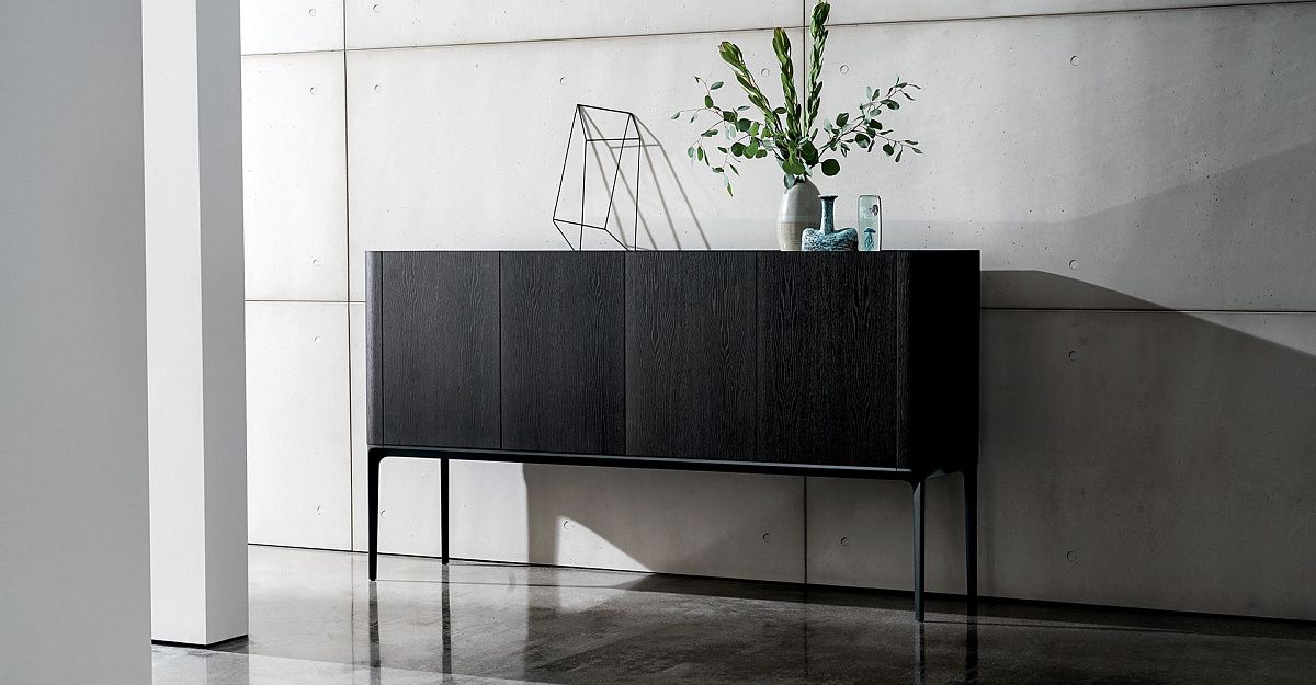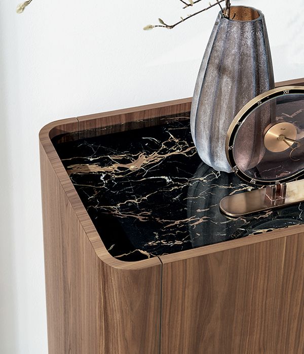 Буфет с алюминиевой конструкцией и ножками, различные варианты отделки. Элементы из МДФ, шпонированные орехом Canaletto или дубом, тонированным в цвет венге. Столешница доступна в различных материалах и отделках. Регулируемая по высоте внутренняя полка из дымчатого стекла.