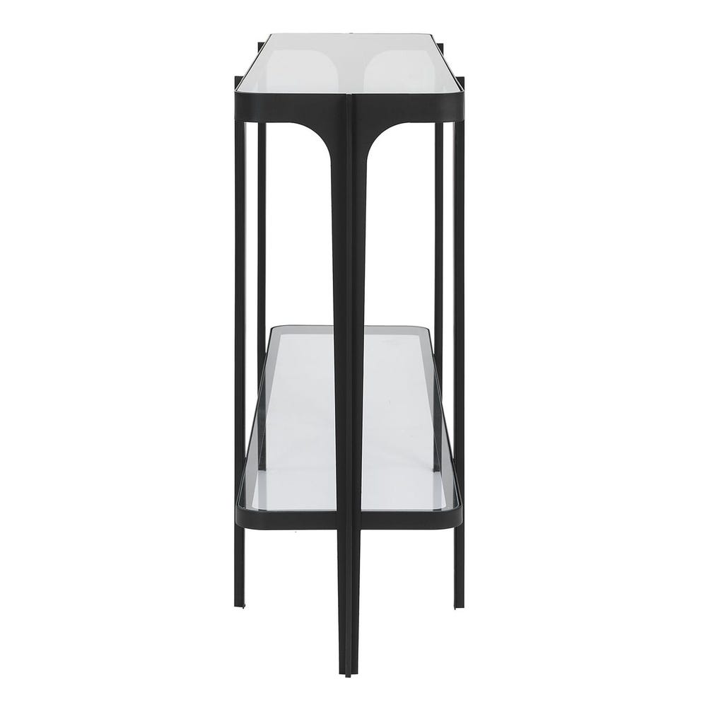 Этот уникальный консольный столик, отличающийся изящными, чистыми линиями, плавно закругленными углами и матовым черным железным каркасом, привнесет непринужденную элегантность в любую комнату. В комплект входят столешница и нижняя полка из закаленного стекла.